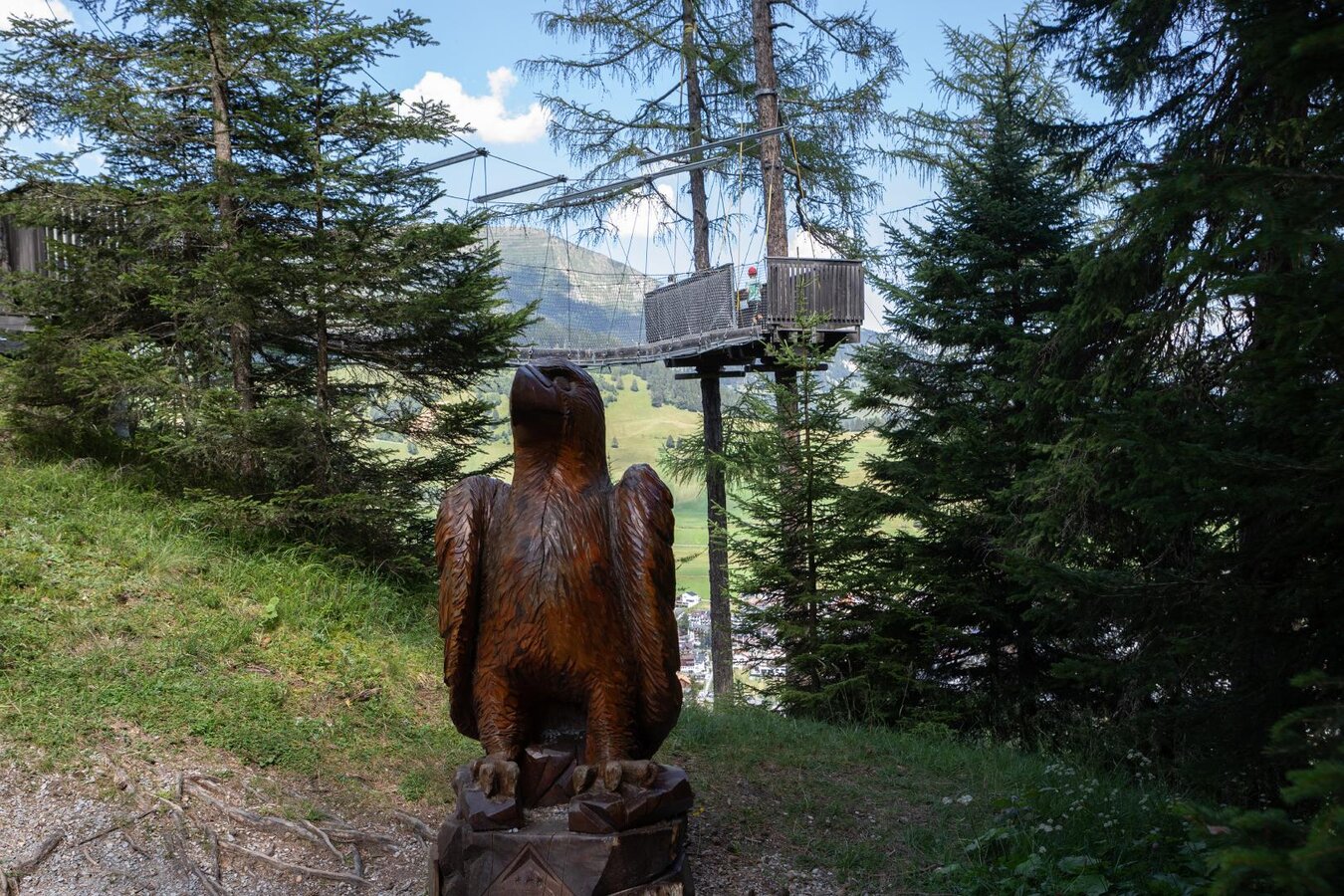Eine Aussichtsplattform, schwindelerregend zwischen Bäumen gebaut und nur über eine wackelige kurze Hängebrücke erreichbar. Hier können Sie fast aus der Vogelperspektive das Dorf Serfaus erkunden, sowie die gesamte Bergumbegung bis zu den Pitztaler und Ötztaler Alpen.