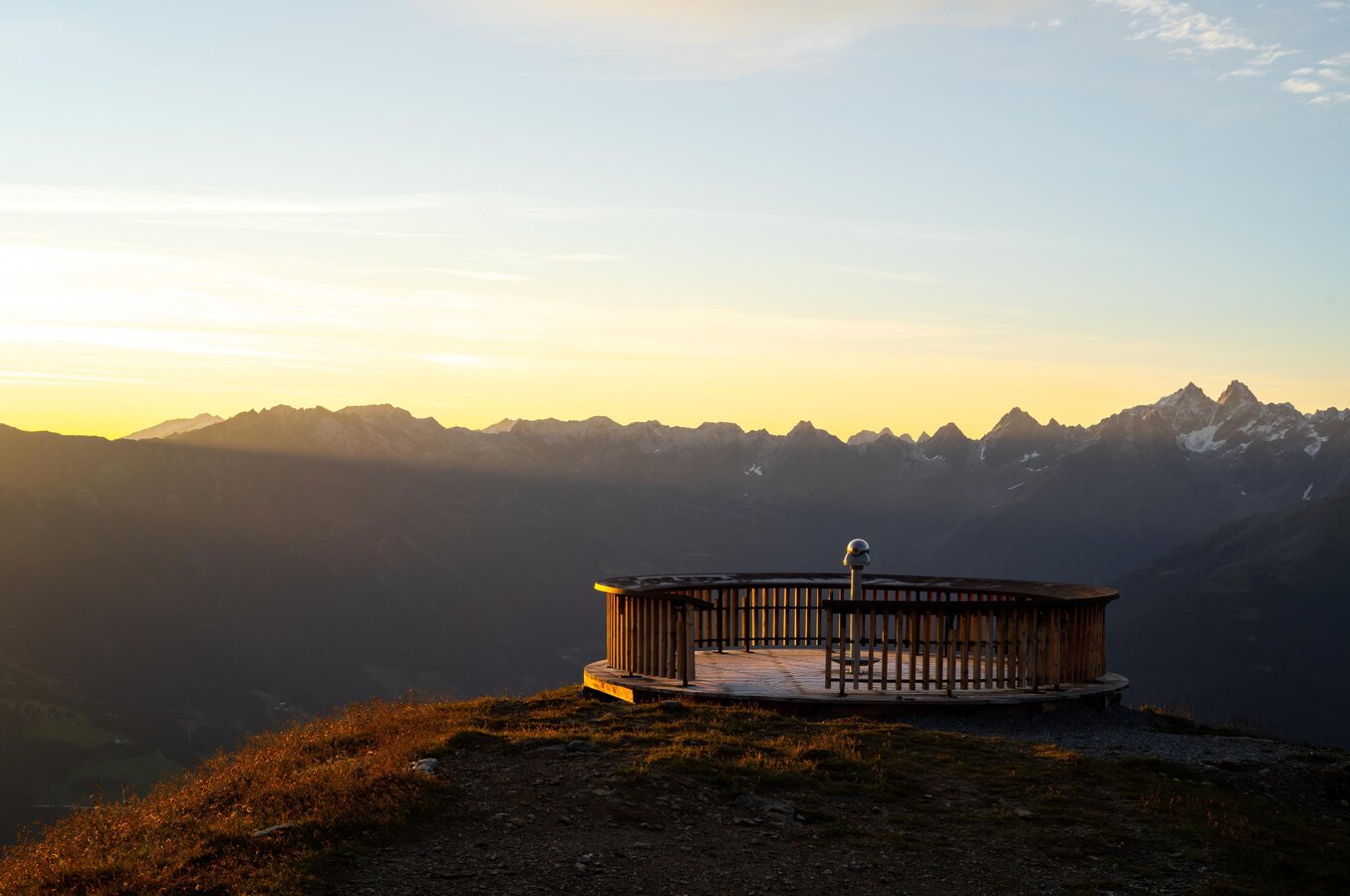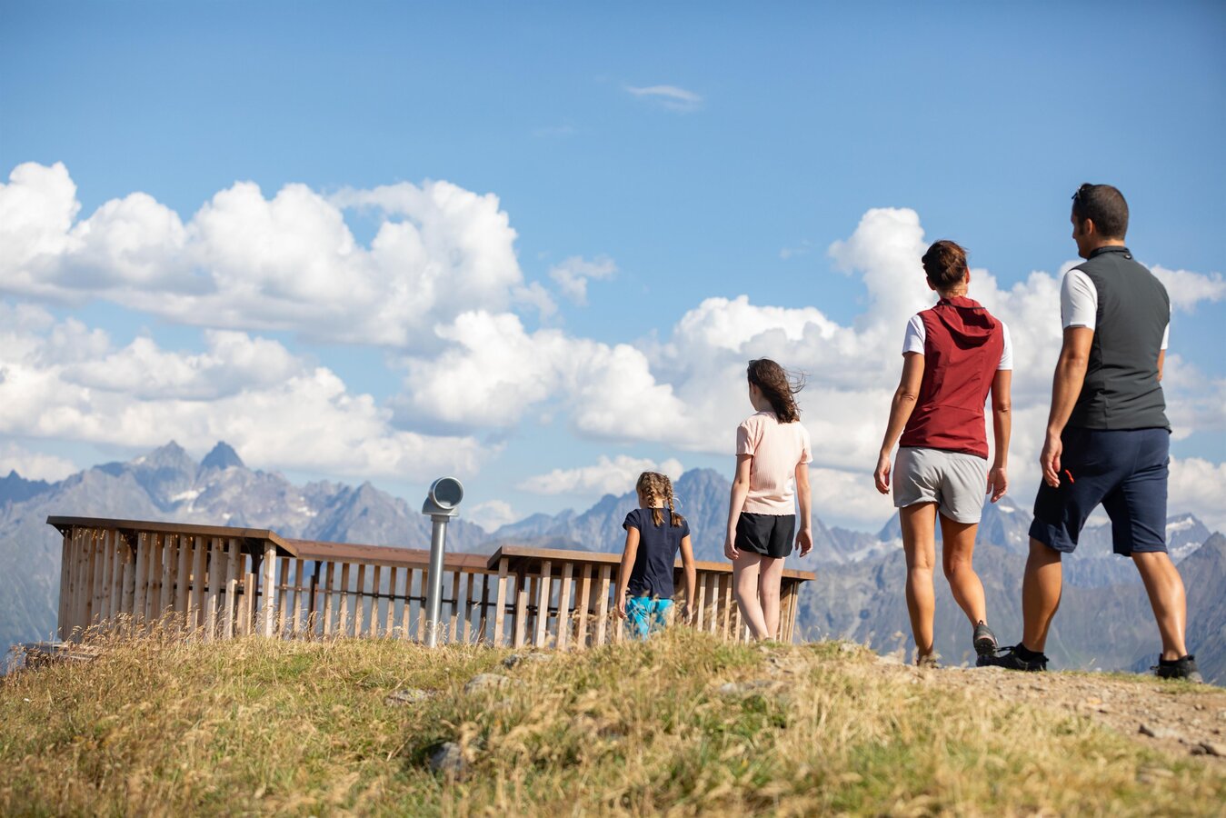 Beim Gipfelkreuz Schönjoch befindet sich der Aussichtsplattform mit herrlichem Rundum-Blick auf die umliegende Berg- und Gipfelwelt.
