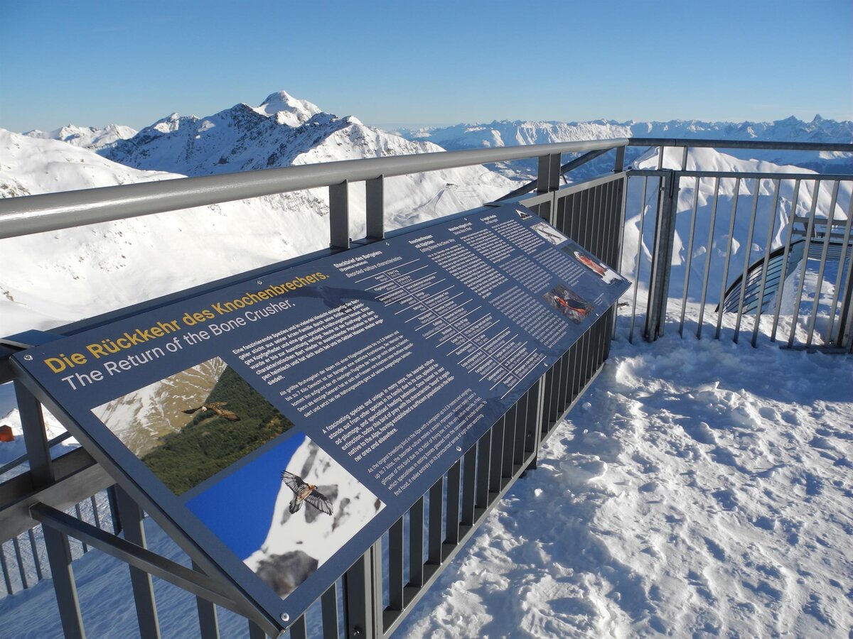 Auf der Aussichtsplattform am Masnerkopf, dem höchsten Punkt im Skigebiet, empfängt Sie eine imposante Bartgeier-Steinskulptur vom Serfauser Bildhauer und Künstler Walter File. Panoramablick - mit und ohne Erlebnisfernrohr - sowie WLAN inklusive.