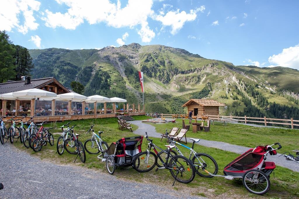 Mit der Schönjochbahn aufs Schönjoch und dann über die Nordseite bis zur Schöngampalm wandern! Nach einer Rast gehts mit dem Mountainbike über den 13 Kilometer langen Forstweg zurück nach Fiss!