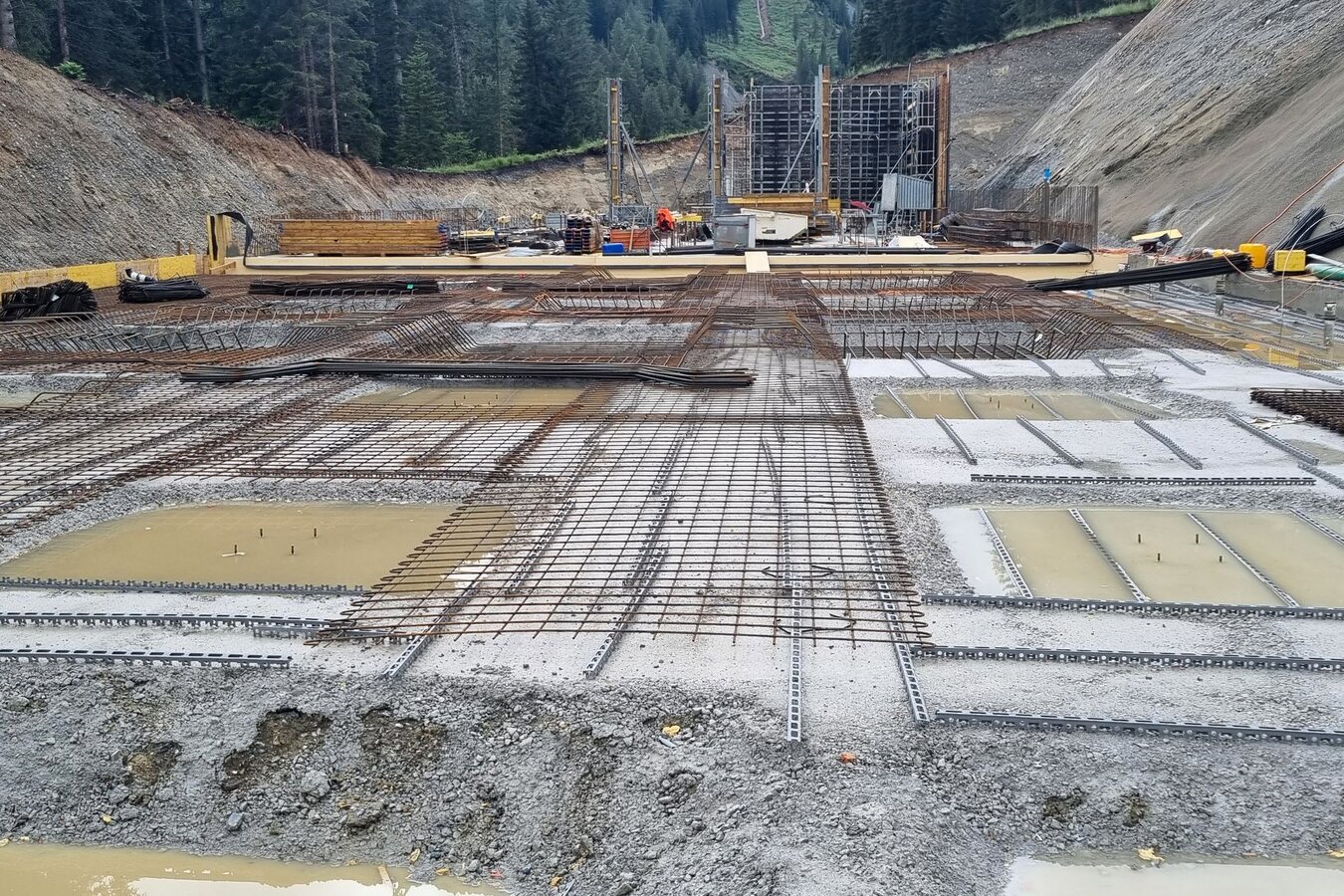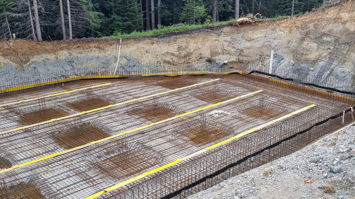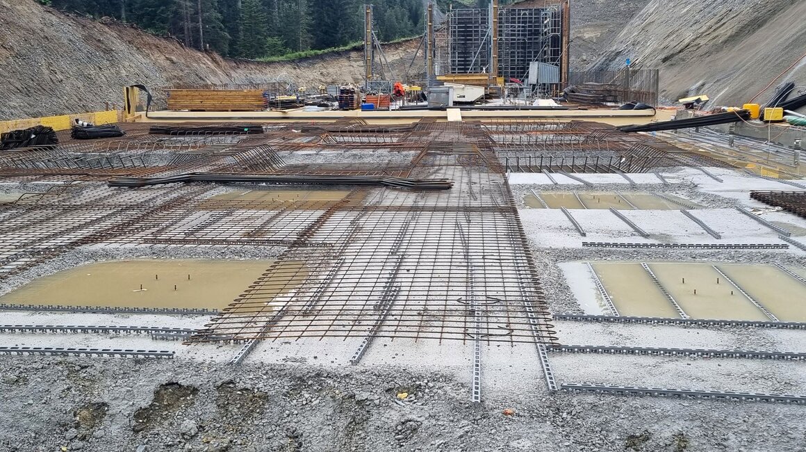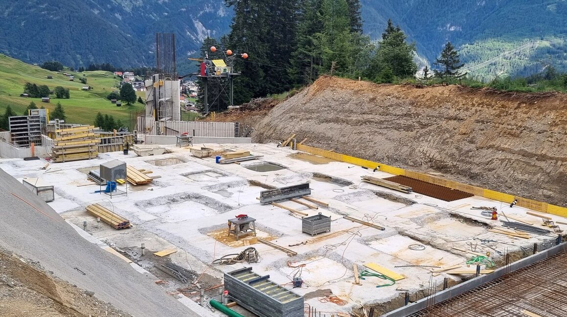 Der Aushub ist bereits komplett erledigt, die ersten Betonarbeiten am Fundament des Kellerbahnhofs sind abgeschlossen (z. B. der vordere Bereich, in dem sich die Kompressorstation befinden wird). Nahezu das gesamte Aushubmaterial wurde im Bereich der Mittelabfahrt zur Pistenkorrektur wieder eingebaut. Das noch verbliebene Material wird für die Hinterfüllung der Station verwendet. Modernste Technik ist auch hier im Einsatz. So sind die Bagger mit einem System ausgestattet, das per GPS die Höhen exakt angibt und die Bagger keine unnötigen Grabungen durchführen müssen.