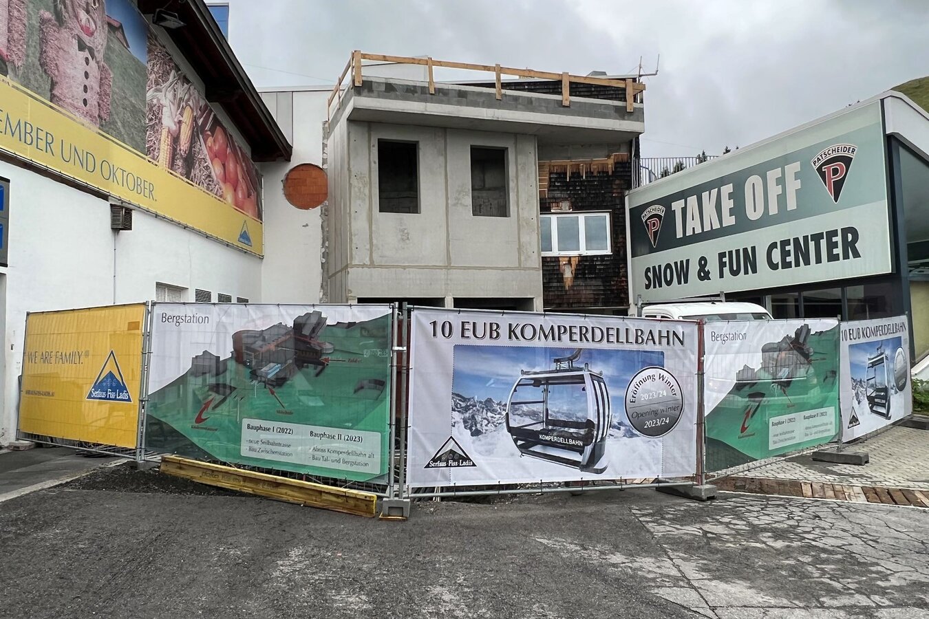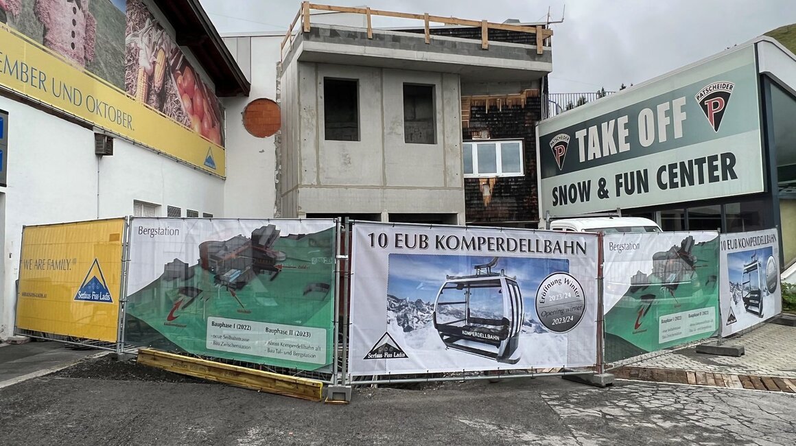 Durch Bauzäune abgeschirmt fällt an der Bergstation der Komperdellbahn gar nicht auf, dass auch hier bereits Vorarbeiten für die neue Bahn von statten gehen. Die ersten Rohbauarbeiten sind erledigt und die Trafostation für die Komperdellbahn wird derzeit umgesiedelt. Einer der Trafos ist auch schon im Einsatz.