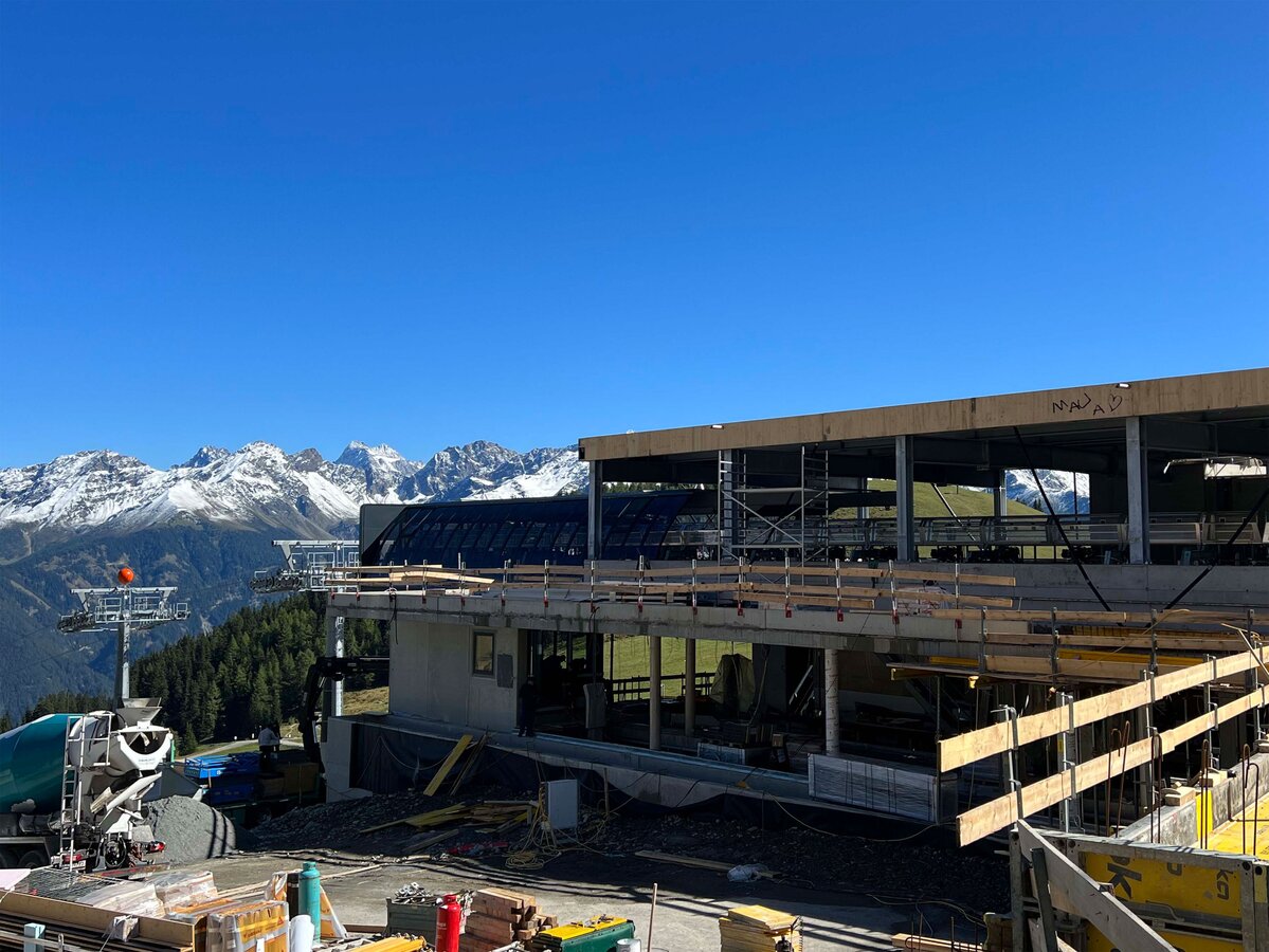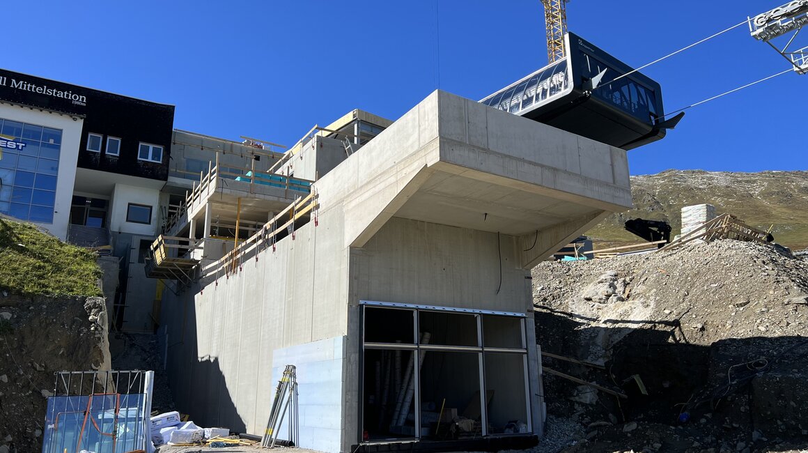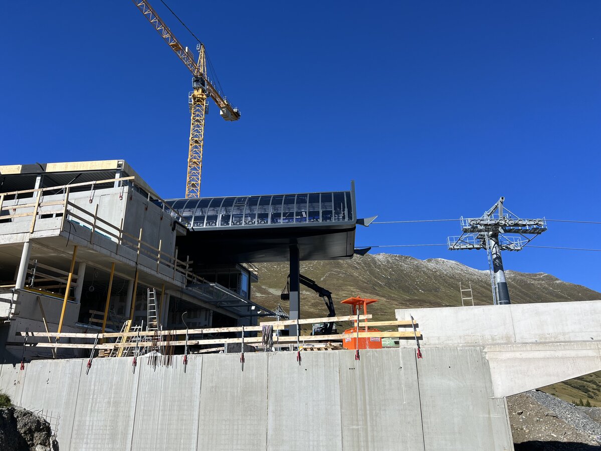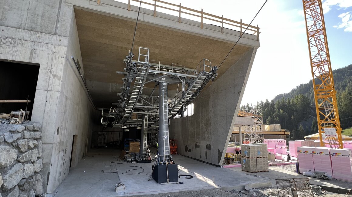 Auch in der Bergstation befinden sich sämtliche Baumeister-Arbeiten in der finalen Phase, es fehlen noch einzelne Stützmauern, Zugangstreppen oder Schneefanggruben im Bahnbereich. Aber auch diese Arbeiten können demnächst abgeschlossen werden. Die Einfahrt des Stationsgebäudes ist bereits verglast, die Dachblenden sind montiert. Auch hier arbeitet die Firma Doppelmayr an diversen Einstellarbeiten. Testfahrten mit den ersten Gondeln konnten erfolgreich durchgeführt werden. Derzeit werden noch sämtliche Installationen (Heizung, Lüftung, Sanitär,...) durchgeführt, sowie der Estrich verlegt. Der Pistenbau ist bis knapp vor dem Gebäude bereits abgeschlossen.