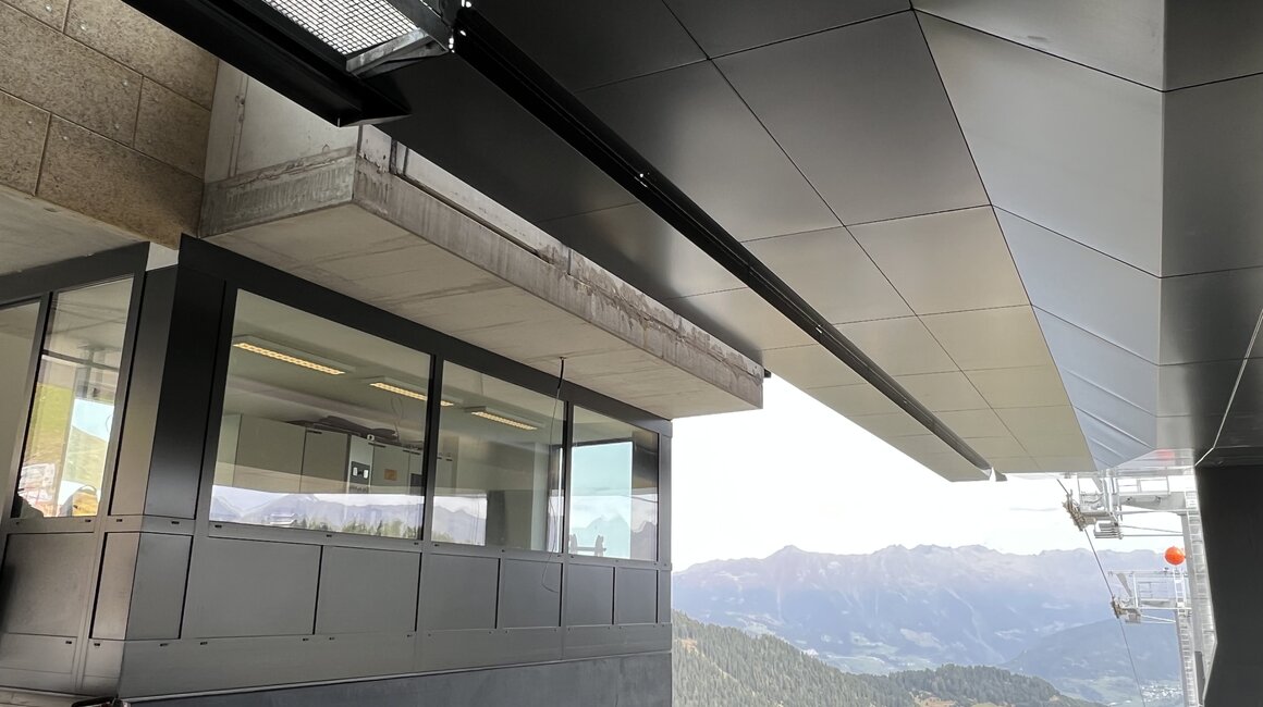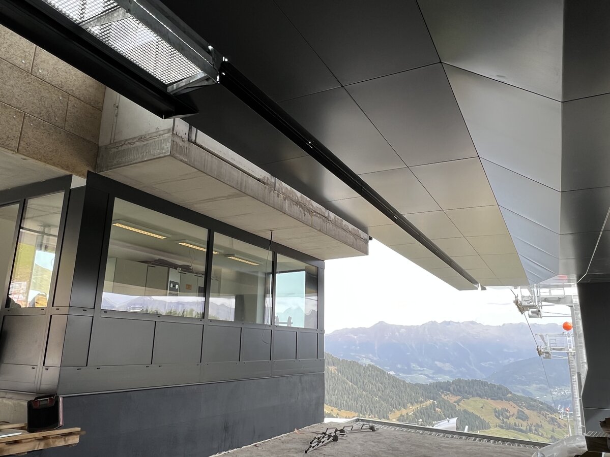 Zeitgleich werden an der Talstation die Verglasungen am Stationsgebäude eingesetzt. Diese sind – im Sinne erneuerbarer Energie - als Photovoltaik-Anlage ausgeführt. An der Fassade wird die Isolierung angebracht, damit der Zimmermann schon demnächst mit der Verkleidung (Holzlamellen) beginnen kann. Letzte Baumeisterarbeiten sind ebenfalls in Gange – wie zum Beispiel die Fertigstellung der Schneefanggruben (in den Zugangsbereichen zur Bahn) oder die Trägerkonstruktion (Bachüberbauung) als Verbindung zum Sunliner.