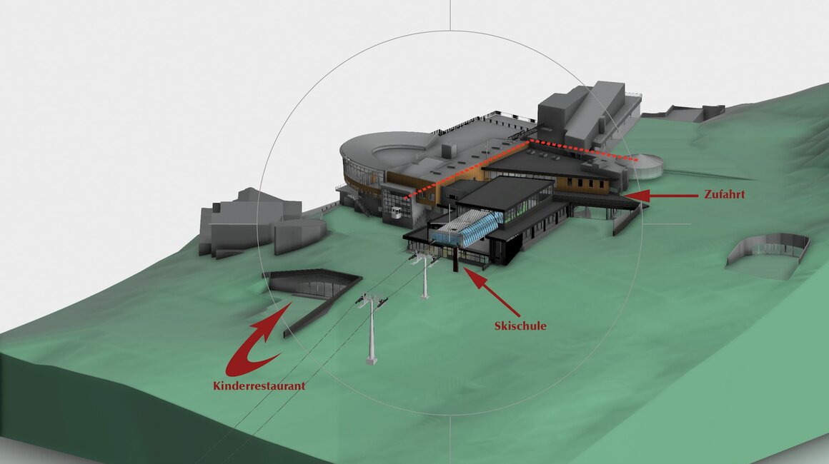 Die Talstation wird an der Nordseite des bestehenden Gebäudes komplett neu errichtet. Ein großes Skidepot mit über 5.000 Stellplätzen, ein Skiverleih mit Shop sowie großzügige Lagerflächen für die Seilbahn werden Platz finden. In der Bergstation wird das Skischulgebäude komplett neu situiert sowie ein direkter Zugang zur Kinderschneealm geschaffen.
