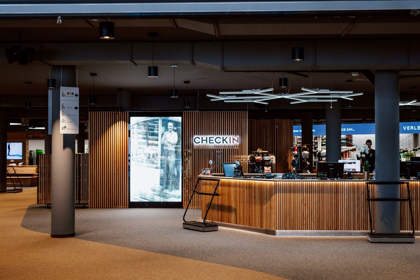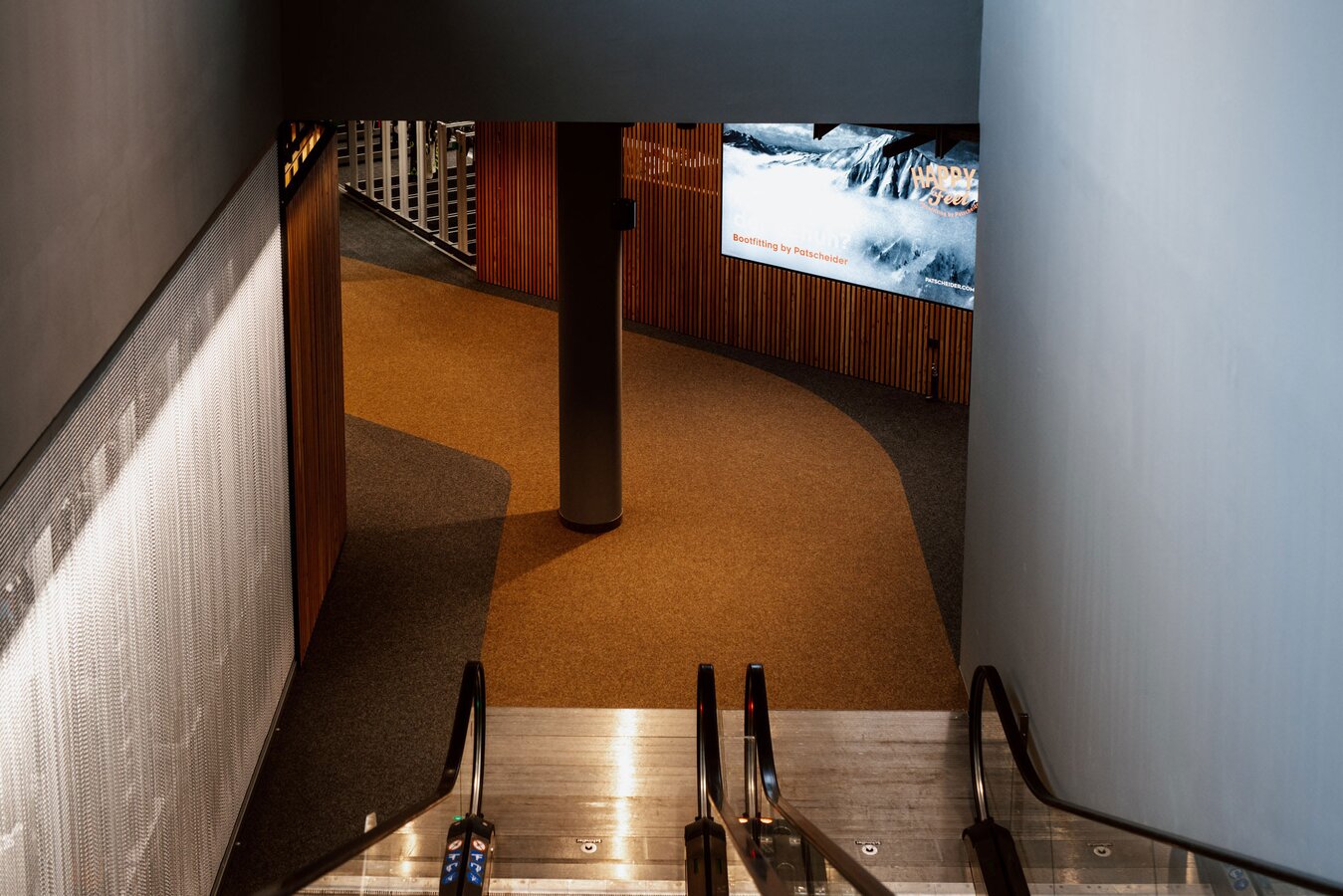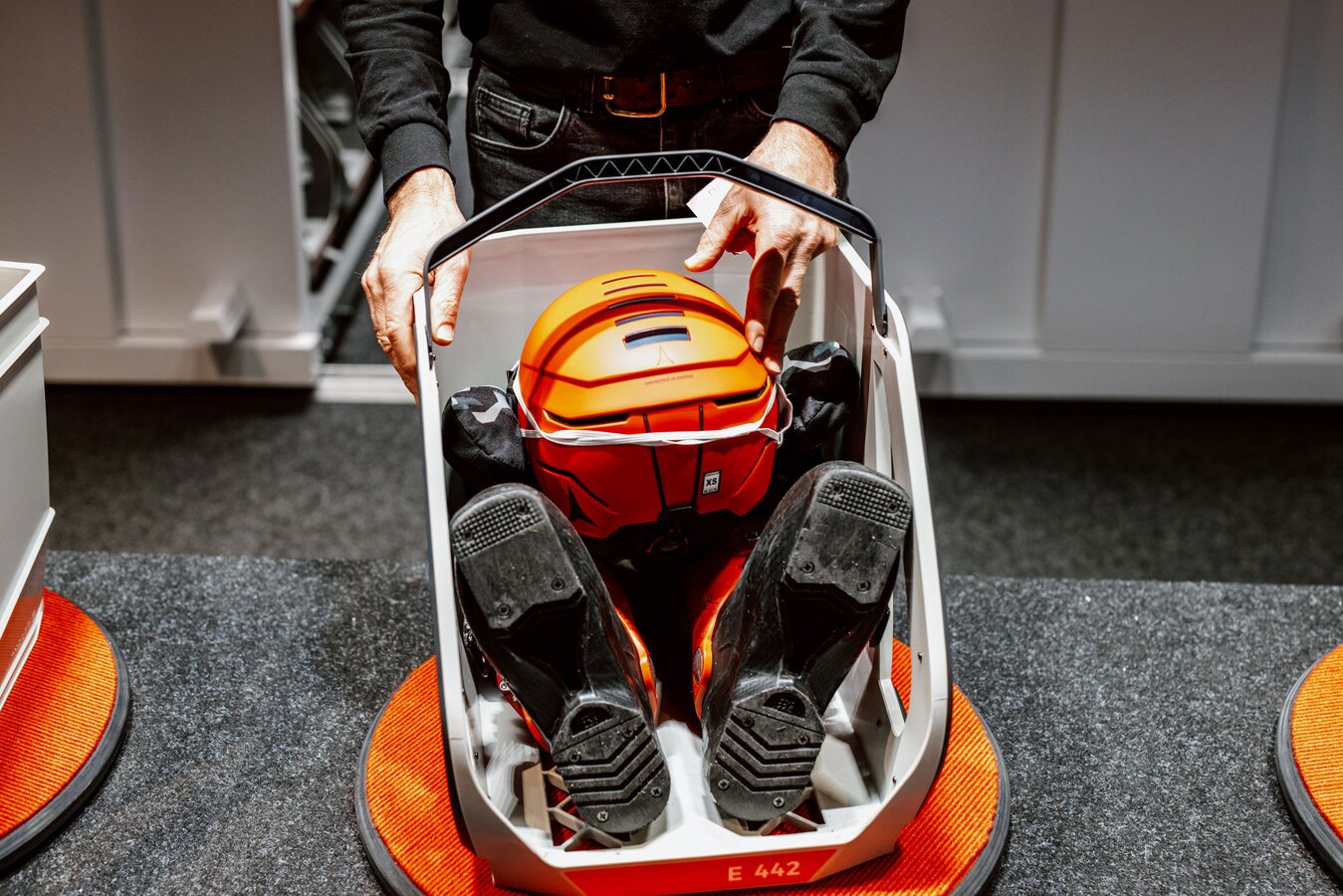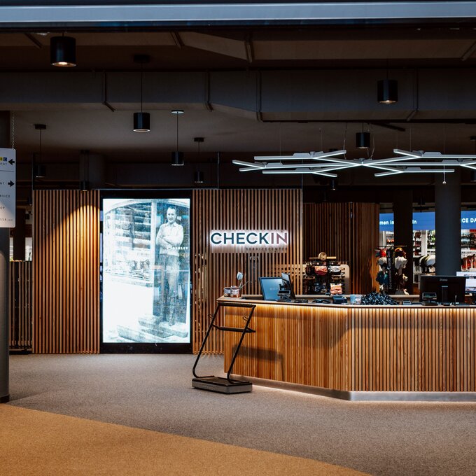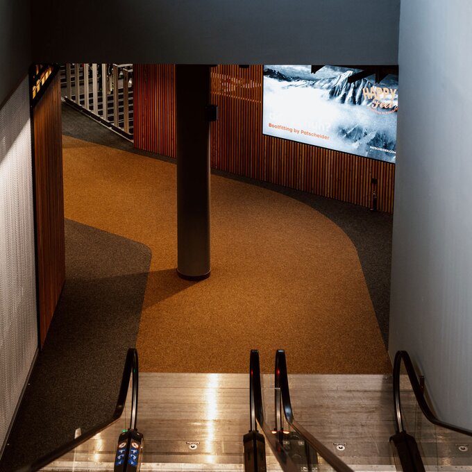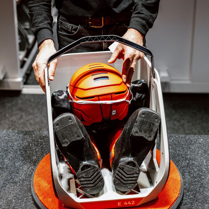 Unter der Erde befinden sich zwei Stockwerke: Einmal das Skidepot und Servicecenter von Sport Patscheider und im untersten Stock ein großes Lager sowie Mitarbeiterräume. Das Servicecenter „CheckIn“ wartet gleich mit zwei Besonderheiten auf: Zum einen setzt man im Skidepot nicht auf Self-Service, sondern wird bedient. Zum anderen kann die persönliche Ausrüstung hier über Nacht sicher verwahrt werden – und dazu nutzt man die eigens von Sport Patscheider entwickelten Boxen, in denen Schuhe, Helm und sogar Handschuhe getrocknet werden. So kann man am nächsten Tag die Straßenschuhe gegen vorgewärmte und trockene Skiausrüstung tauschen. Wie praktisch!