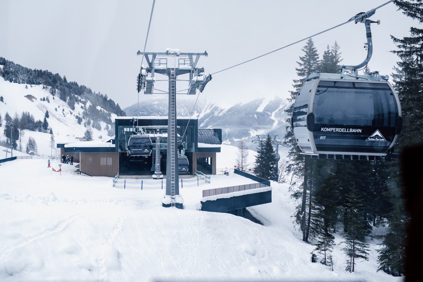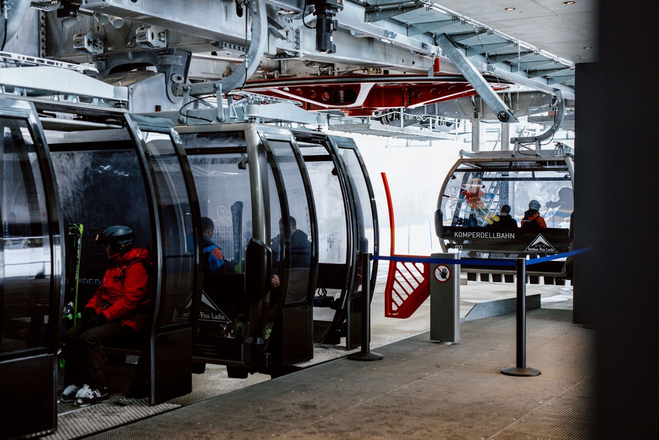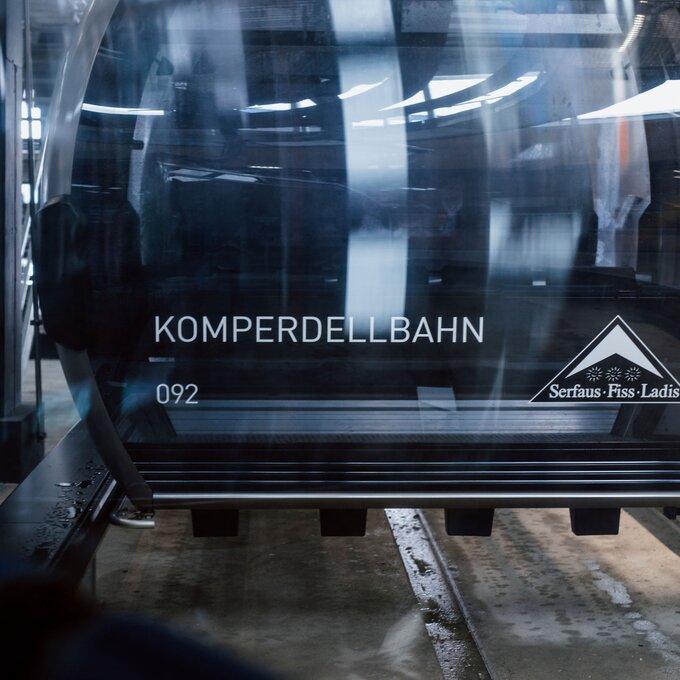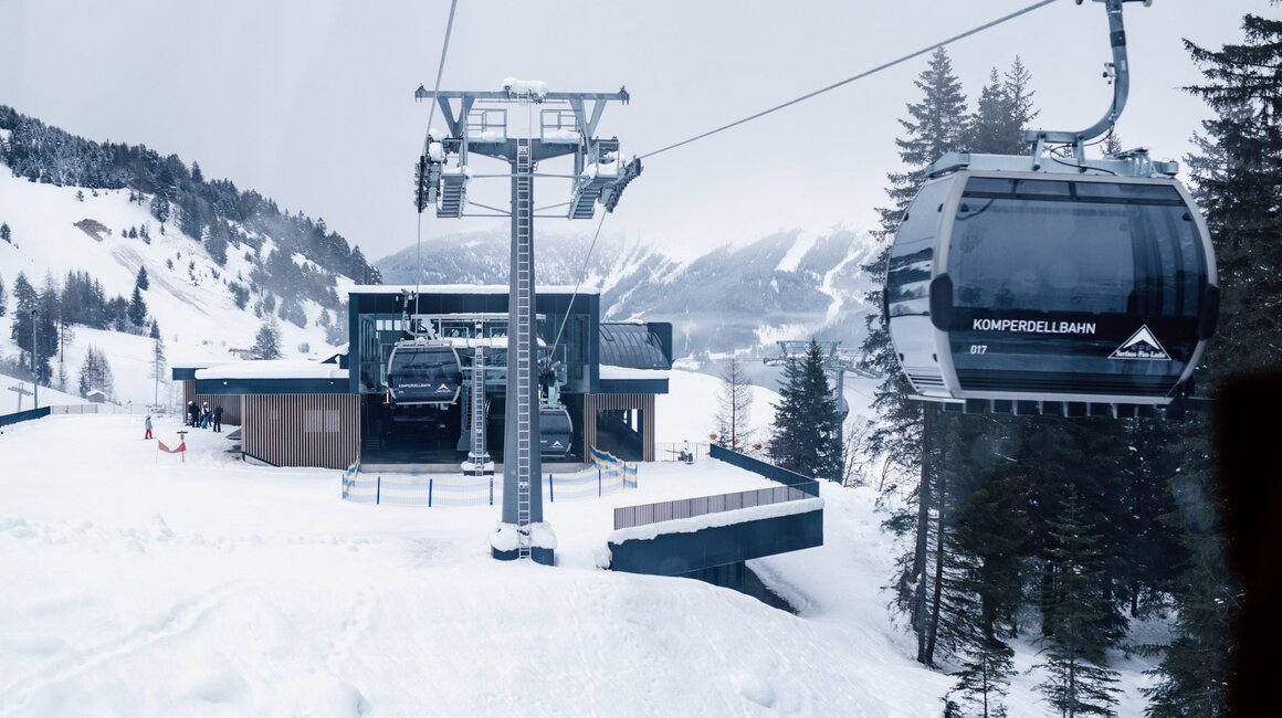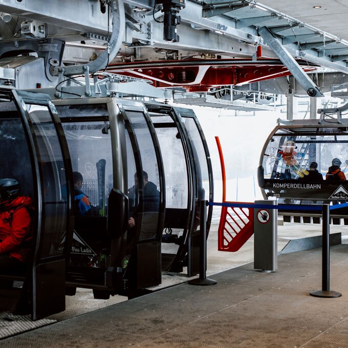 Aktuell sind bei der Komperdellbahn 104 Kabinen am Seil. Damit können 3.000 Personen pro Stunde befördert werden. „Das ist aber noch nicht der Endausbau“, sagt Reini. „Wir können die Förderkapazität auf bis zu 3.500 Personen pro Stunde erhöhen.“ Der Einstieg in die modernen Kabinen ist auch mit Kinderwagen oder Rollstuhl problemlos möglich. „Die Kabinen fahren sehr langsam durch die Station und die Ski werden in die Kabinen mitgenommen. Damit entfällt das hektische Ski-in-den-Skikorb-stellen, das in der Vergangenheit oftmals für einen kurzen Stau beim Einsteigen gesorgt hat.