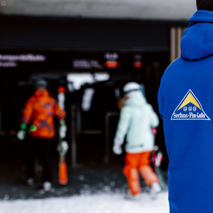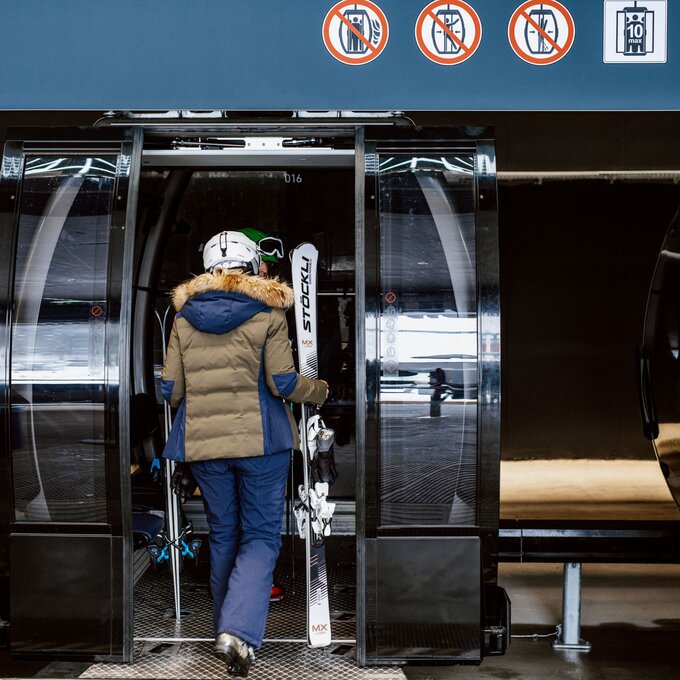 „Die Kabinen selbst sind eine Sonderanfertigung“, sagt Reini, als er auf einem der zehn Sitze in den Panoramakabinen Platz nimmt. „Die Firma Doppelmayr hat sie in Zusammenarbeit mit den Bergbahnen Serfaus-Fiss-Ladis speziell für uns entwickelt. Die Besonderheit daran ist, dass sie sehr geräumig sind, weil die Ski seitlich neben dem Sitz abgestellt werden können. So kann man auch an der Zwischenstation ganz bequem aussteigen, selbst wenn man es sich auf einem der hinteren Sitze der Kabine gemütlich gemacht hat.“ Zusätzlich bietet jede Kabine durch die Komplettverglasung einen beeindruckenden Panoramablick. „Der ist zwar heute durch Nebel getrübt, aber wenn man hier bei gutem Wetter nach oben fährt – oder schon eher schwebt! – ist das ein Wahnsinn“, freut sich Reini.