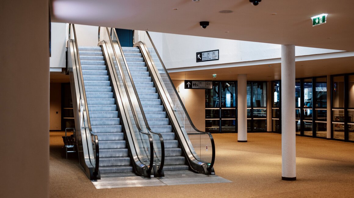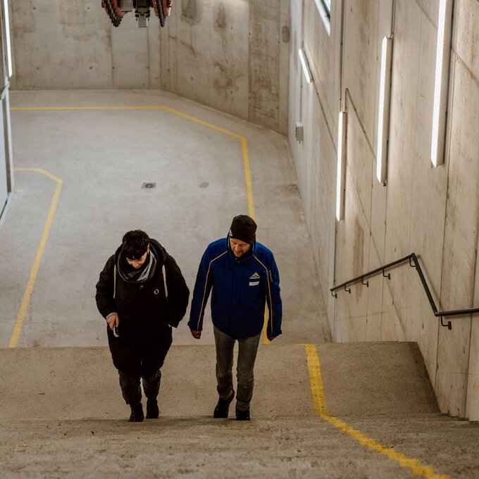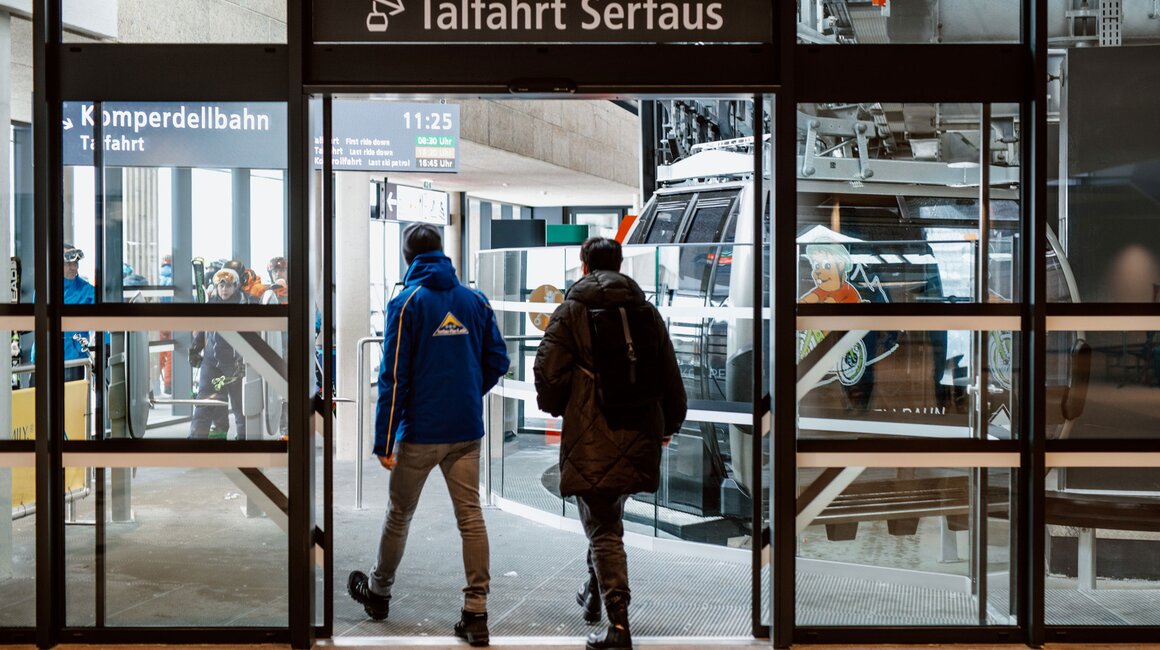 Schon am neuen Vorplatz, zwischen Alpkopfbahn und Komperdellbahn, zeigt sich, dass sich der große Umbau gelohnt hat: Es gibt jetzt viel mehr Platz für ankommende Skifahrer. „Dadurch, dass die Talstation in den Hang hinein gebaut wurde, wirkt der ganze Platz viel weitläufiger.“ Das wahre Raumwunder verbirgt sich aber unter der Erde – und deshalb geht es per Rolltreppe erst einmal eine Etage nach unten, bevor die neue Komperdellbahn uns bequem Richtung Berg befördert.