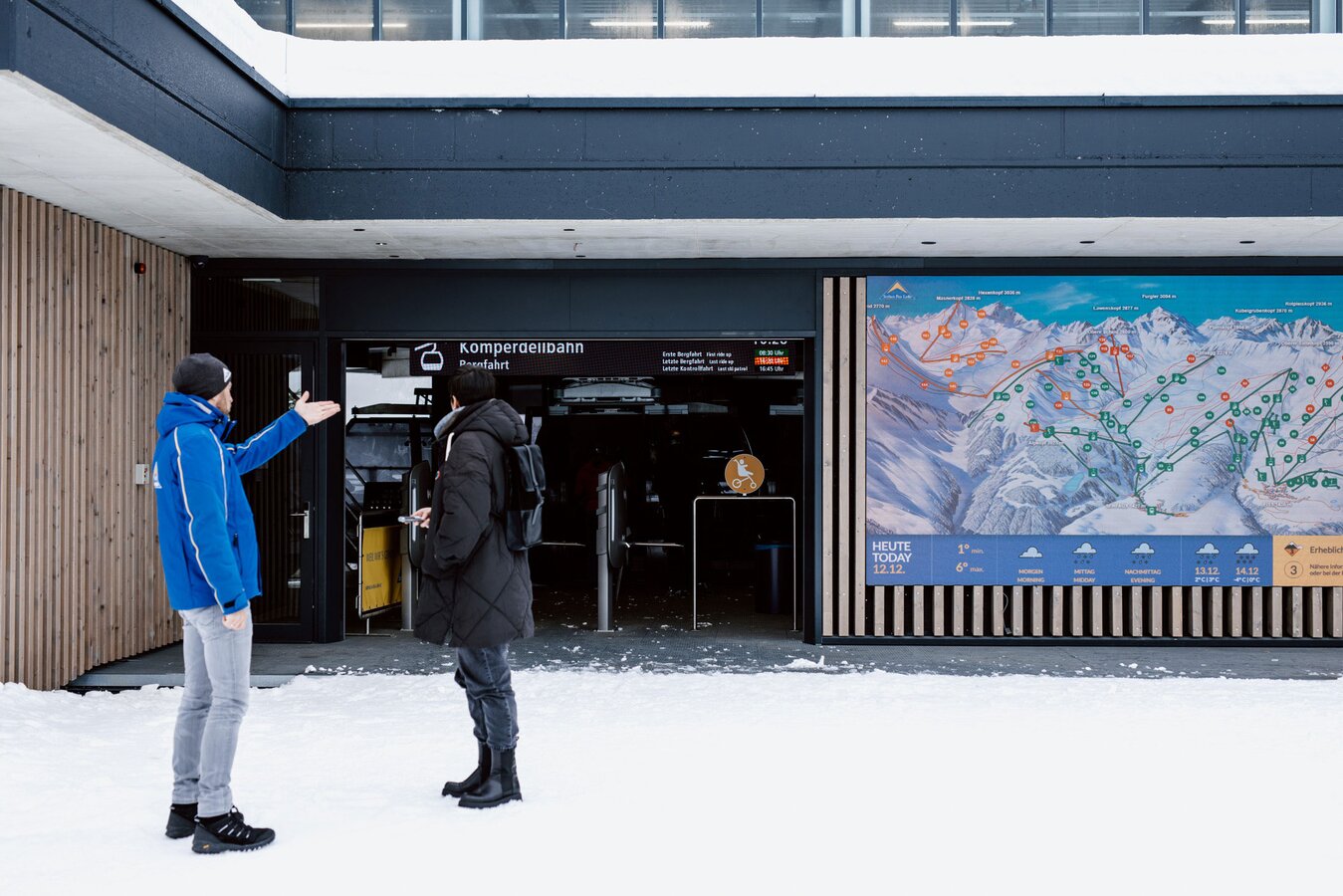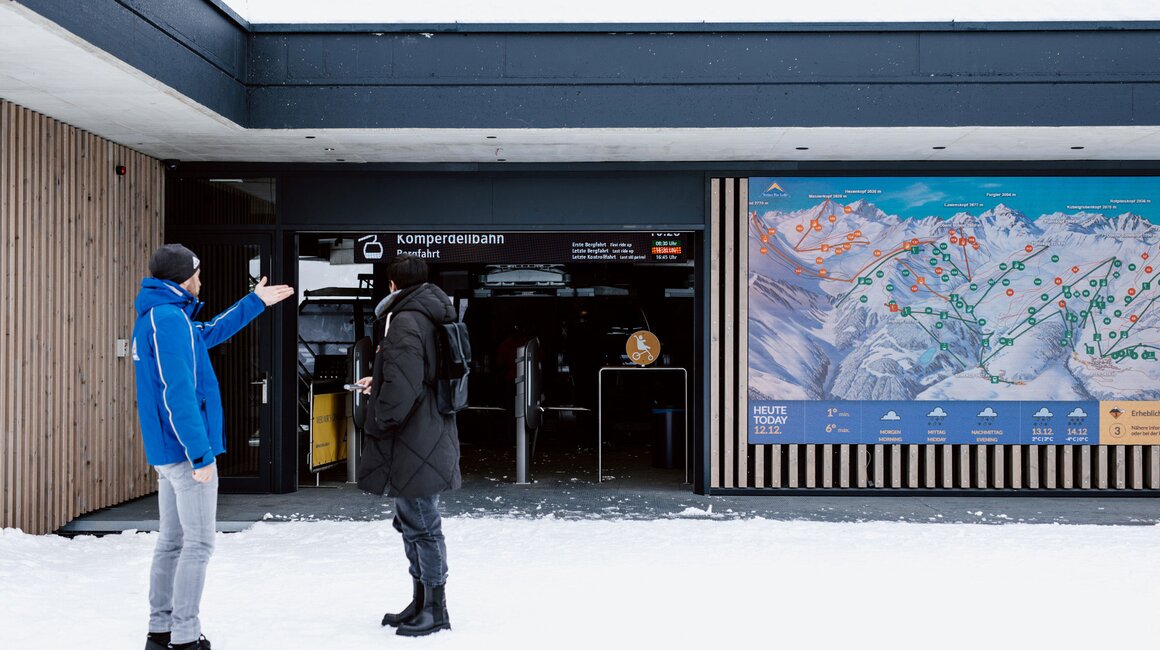 An der Bergstation angekommen, erinnert sich Reini zurück in den August, als er durch den Rohbau geführt wurde, um das zukünftige Gästeleitsystem zu besprechen: „Teilweise war ich total desorientiert und verwundert, wie das am Ende aussehen kann. Aber jetzt ist alles durchdacht und macht Sinn.“ Per Rolltreppe oder Aufzug kann der Gast bequem vom Ausstieg zur Skischule oder zur Kinderschneealm gelangen oder wird durch das neue Bergstation-Gebäude zur nächsten Bahn geleitet. „Insgesamt bringt die neue Komperdellbahn sicher eine Aufwertung für die ganze Region“, ist Reini überzeugt. „Und wenn wir jetzt hören, was für eine Freude die Gäste, aber auch die Einheimischen mit der neuen Bahn haben, dann hat sich das Projekt auf jeden Fall schon gelohnt.“