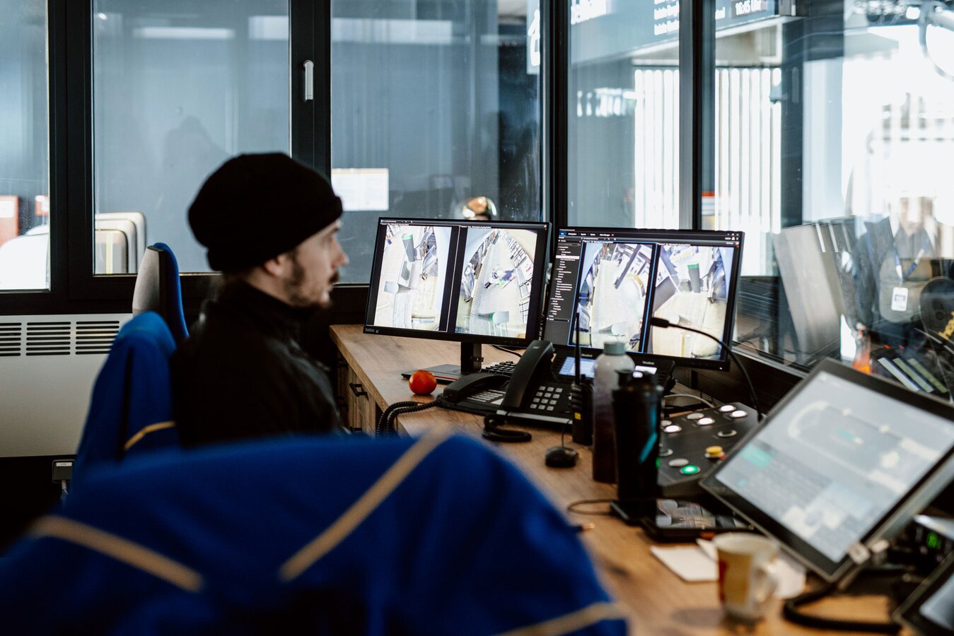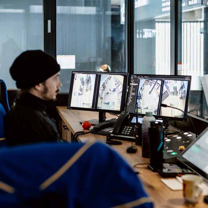 Die Zwischenstation, die bei der Trassenführung neu dazu gekommen ist, beherbergt neben dem Bahnhof, in dem die Kabinen während der Nacht untergebracht sind, auch die Kontrollzentrale der neuen Bahn. „Die Komperdellbahn ist mit dem neu entwickelten AURO-System ausgestattet – als eine der ersten Bahnen österreichweit. Das AURO-System würde es ermöglichen, die gesamte Anlage mit nur einer Person hier in der Zentrale in der Zwischenstation zu betreiben. In der Berg- und Talstation wird alles mittels Kameras und Sensoren überwacht“, erklärt Reini. „Das ist natürlich nicht unser Ziel, wir wollen ja unseren Gästen die bestmögliche Dienstleistung bieten. Aber bei Personalengpässen, wenn etwa jemand krank ist, könnte man den Betrieb mit nur einem Mitarbeiter weiterführen und die Sicherheit der Fahrgäste wäre selbstverständlich dennoch garantiert.“