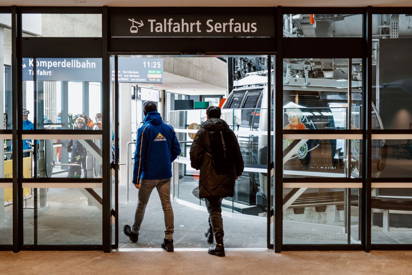 Per Rolltreppe geht es dann nach oben und schon steht man vor dem Eingang zur neuen Komperdellbahn. Die Talstation ist elegant mit Holzlamellen verkleidet, LED-Displays bieten alle Informationen zu Berg- und Talfahrten sowie Betriebszeiten. „Diese Displays haben uns vor der offiziellen Abnahme noch ein bisschen gefuchst“, erinnert sich Reini. Nervös war das Team der Seilbahn Komperdell GmbH vor der finalen Überprüfung und Freigabe der Bahn durch die Seilbahnbehörde trotzdem nicht. „Da passiert schon im Vorfeld der Abnahme so viel, dass dieser finale Akt beinahe zur Formsache wird. Die Verantwortlichen der Behörde waren auch nicht nur für einen Tag da, sondern reisten bereits eine Woche davor an und gaben Empfehlungen ab, wo noch nachjustiert werden musste. Am großen Tag selbst – bei uns war das der 6. Dezember – prüften sie alles noch einmal von A bis Z. Um neun Uhr abends erhielten wir dann das finale Go für den Fahrbetrieb.“