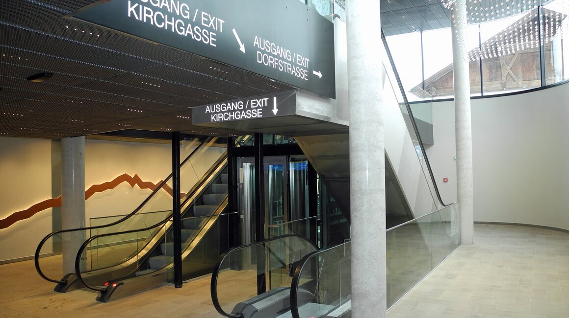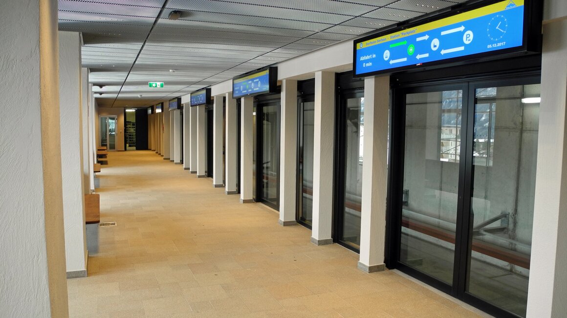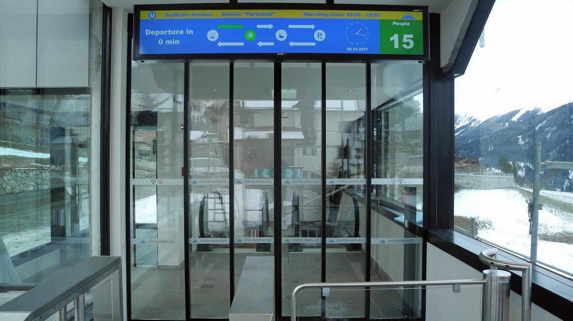 Schon am Ortseingang ist unschwer zu erkennen, dass die erste Phase der Erneuerung abgeschlossen ist. Von der Dorfbahnstraße aus ist die Station Parkplatz ganz bequem über Rolltreppen bzw. einen Aufzug zu erreichen. Der Zugang vom Parkplatz zur Station ist nach wie vor derselbe. Schon beim Betreten der „neuen“ Station wird man von der Helligkeit und der offenen Bauweise positiv überrascht. Und was ist das? Man sieht jetzt sogar den Tunnel, in dem sich die Bahn fortbewegt – großzügige Fensterfronten ermöglichen diesen neuen Einblick. Über den Türen sind große Bildschirme angebracht, auf denen man abwechselnd den aktuellen Bahnstatus, sowie Wetterinfos, aber auch Livebilder aus dem Skigebiet verfolgen kann. Diese Bildschirme sind übrigens in allen neuen Stationen installiert.