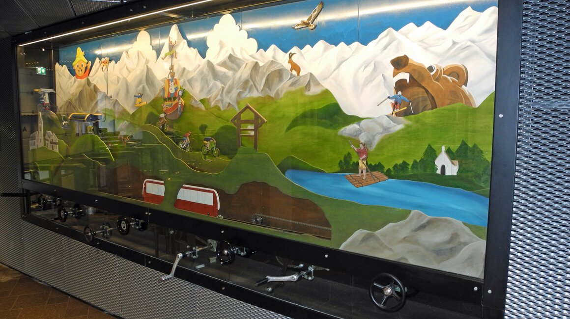 Weiß jemand, was eine Erlebnismaschine ist? Nein? Dann ist ein Besuch der Seilbahn Endstation ein absolutes MUSS. Dort verbirgt sich hinter einer großen Glasscheibe nämlich ein tolles, interaktives Bild, welches nicht nur bestaunt werden will! Über verschiedene Hebel und Kurbeln kann das Bild bewegt und verändert werden, so fahren zum Beispiel Biker entlang einer Radstrecke oder das Maskottchen Murmli winkt immer wieder hinter den Bergen hervor. Auch für Interessierte der U-Bahn-Technik wurde ein eigener Bereich eingerichtet, in dem die Entstehungsgeschichte der U-Bahn Serfaus von Zeitzeugen erzählt wird.
