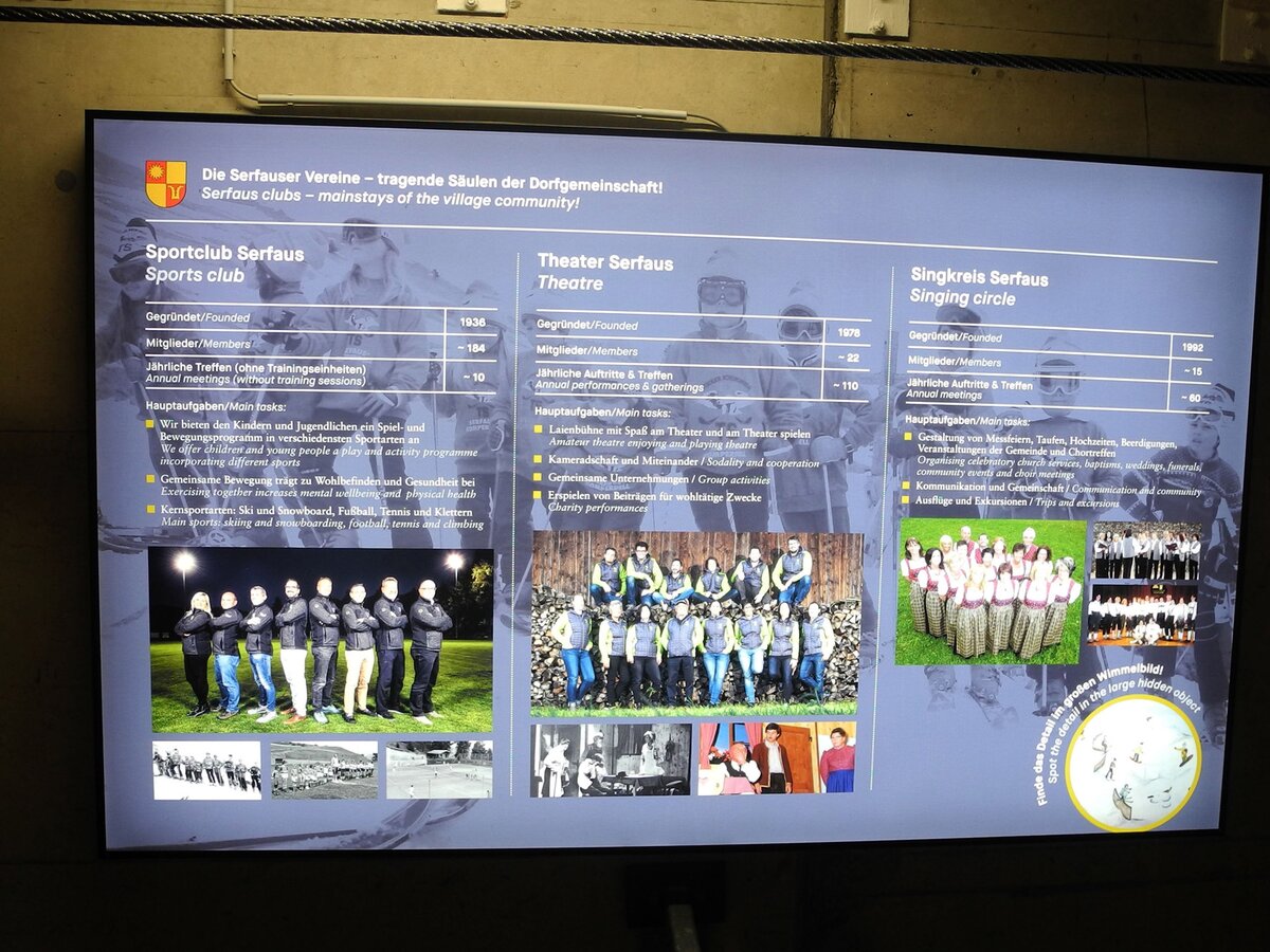 Wie bereits angekündigt, findet man auch in der Station Zentrum tolle Inszenierungen vor. „Die Serfauser Vereine – tragende Säulen der Dorfgemeinschaft“, lautet das übergeordnete Thema. Sämtliche Serfauser Vereine werden sowohl bildlich als auch textlich informativ auf verschiedene Art und Weise dargestellt. Nicht zu übersehen sind die sechs großen Leuchtkästen, die im Tunnel angebracht sind. Um die Wartezeit angenehm zu verkürzen, wurden diese Informationsflächen installiert, wobei man neben tollen Bildern (von früher und heute) auch einen Einblick in die wichtigsten Tätigkeitsbereiche der einzelnen Vereine bekommt. Selbstverständlich findet man auch Daten zum Gründungsjahr, Infos über Mitgliederzahlen und jährliche Zusammenkünfte.