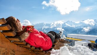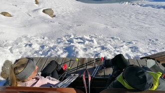Skifahren beansprucht ja bekanntlich ganz schön die Oberschenkel- & Wadenmuskulatur. Wenn die Beine vom vielen "in der Hocke fahren" brennen, kann ein kleines Päuschen zwischendurch wahre Wunder wirken. Wie gut, dass es zahlreiche Ausruhmöglichkeiten direkt neben der Piste gibt. Einer meiner persönlichen Favoriten ist die Wohlfühlstation Waldbahn. Die Station punktet mit einem tollen Ausblick auf die umliegende Bergwelt und auf die darunterliegenden Pisten. Also einfach Ski abschnallen, Beine hochlegen und genießen.