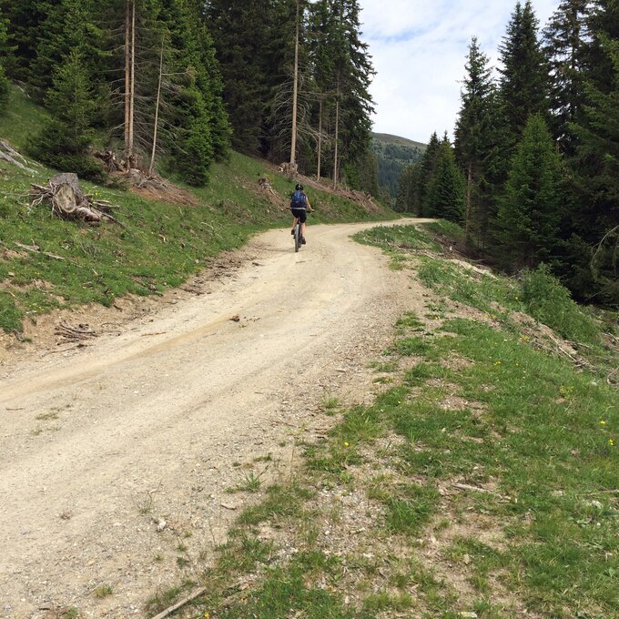Ab der Frommes Alp können die Wadeln dann wieder ein wenig „roschta“ (entspannen), denn es wartet ein gemütlicher Downhill. Anschließend geht es noch einmal in angenehmer Steigung zum höchsten Punkt der Tour: zum Obsteinsboden auf 1.872 m. Ab diesem Punkt heißt es entspannen und talwärts radeln.