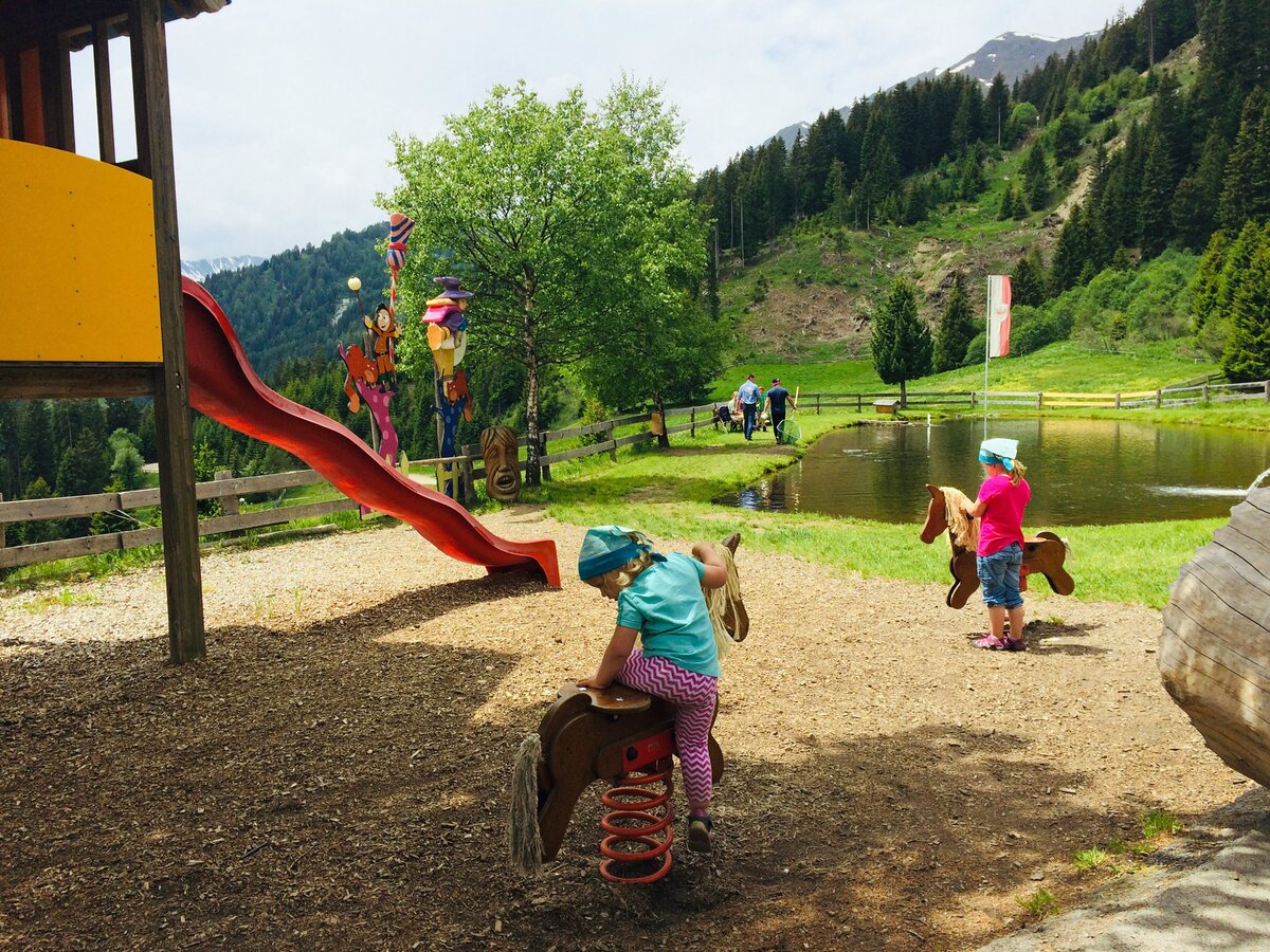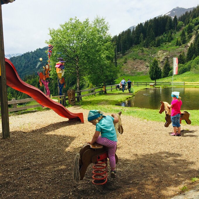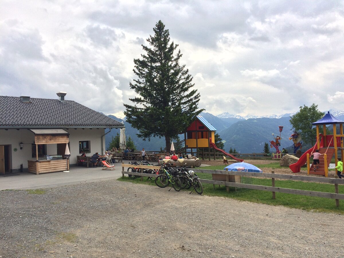Bevor wir Fiss erreichen, lädt die Kuh Alm Fiss (1.768 m), unweit der Mittelstation Schönjoch, zur Einkehr ein. Ein kleiner Teich mit Spielplatz macht den Zwischenstopp zur wahren Erholung. Fischspezialitäten aus dem eigenen Teich erfreuen die Gaumen. Außerdem führt der Hexenweg, einer der drei Abenteuerberge, an der Kuh Alm Fiss vorbei.