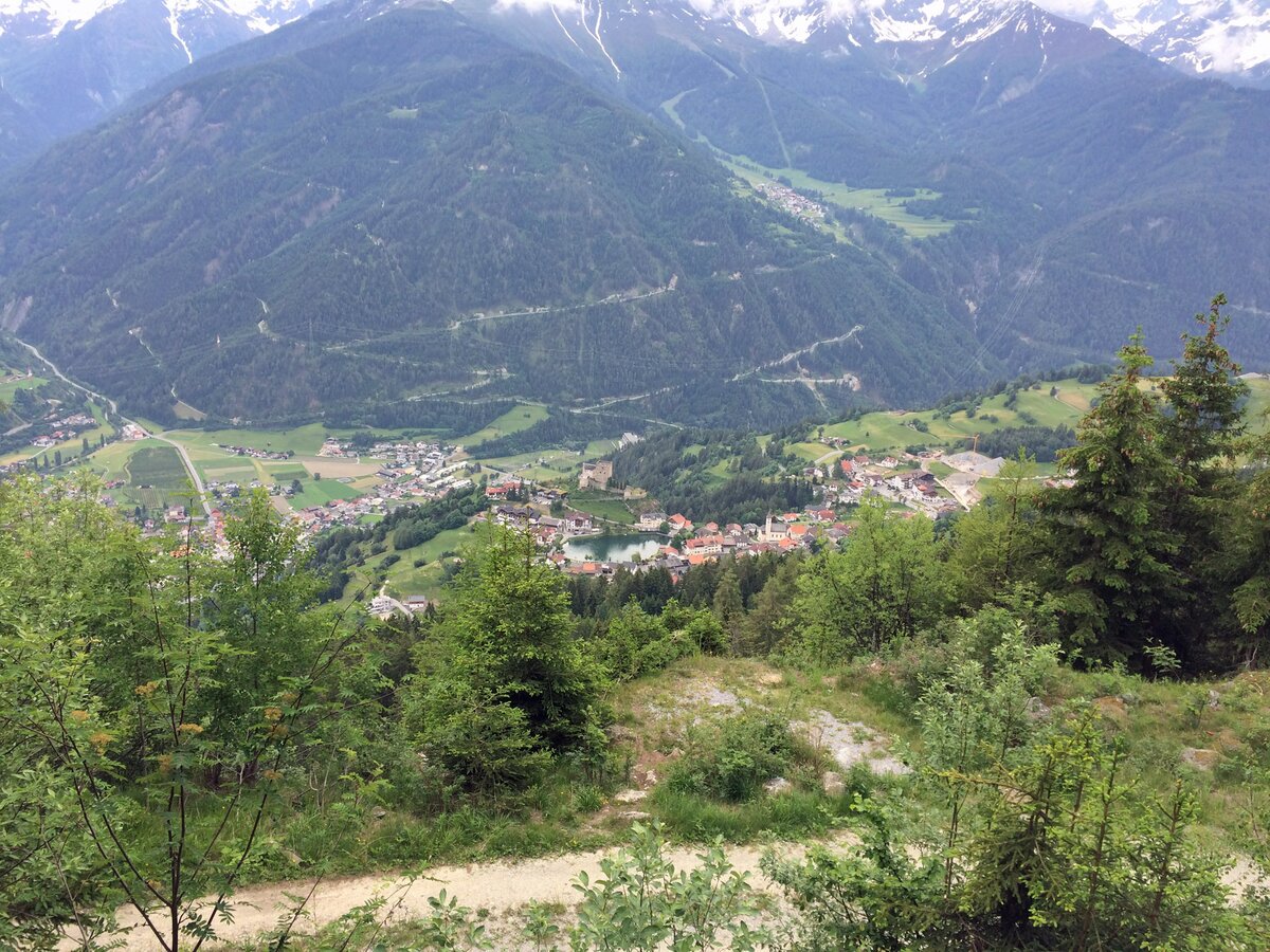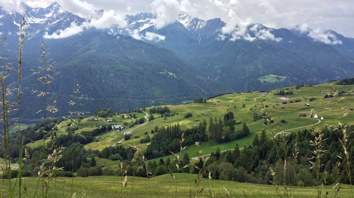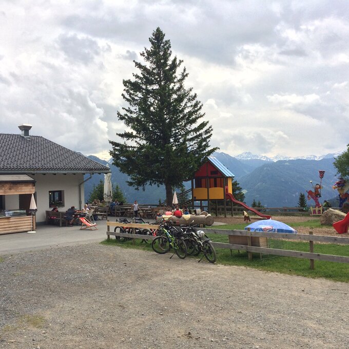 Beim nächsten Tourenstück kommt ihr oberhalb von Obladis vorbei. Tipp: An der Kreuzung einfach geradeaus radeln und beim Café Obladis einkehren. Dort gibt es auch einen Brunnen, aus dem der erfrischende Tiroler Sauerbrunn und Schwefelwasser sprudeln. Jeder Wanderer und Radfahrer kann hier kostenlos seine Flasche auffüllen.