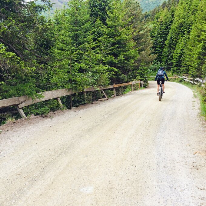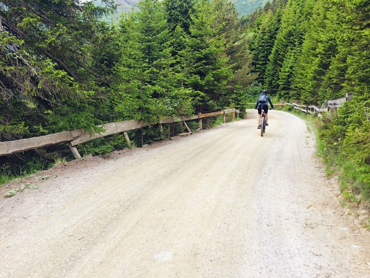 Nach der Kuh Alm Fiss geht es genüsslich auf Schotter- und Asphaltwegen zurück nach Fiss. Ca. 4,5 km liegen noch vor euch bis ihr zum Start der Gample Tour, dem Bikepark Serfaus-Fiss-Ladis, zurückkehrt.