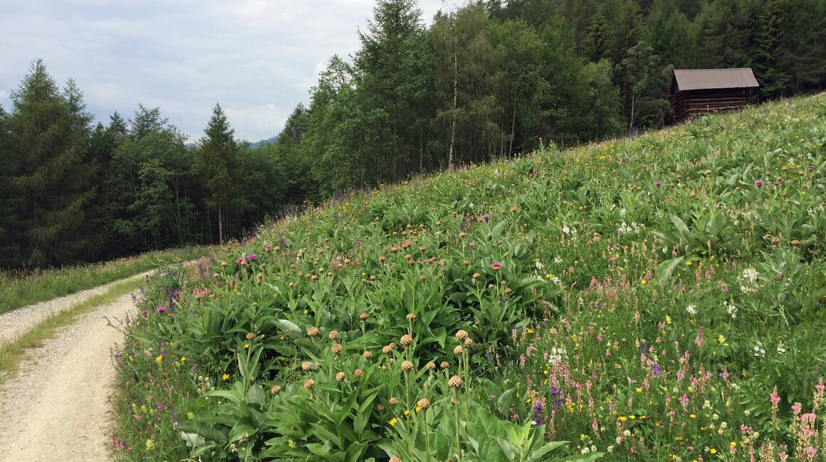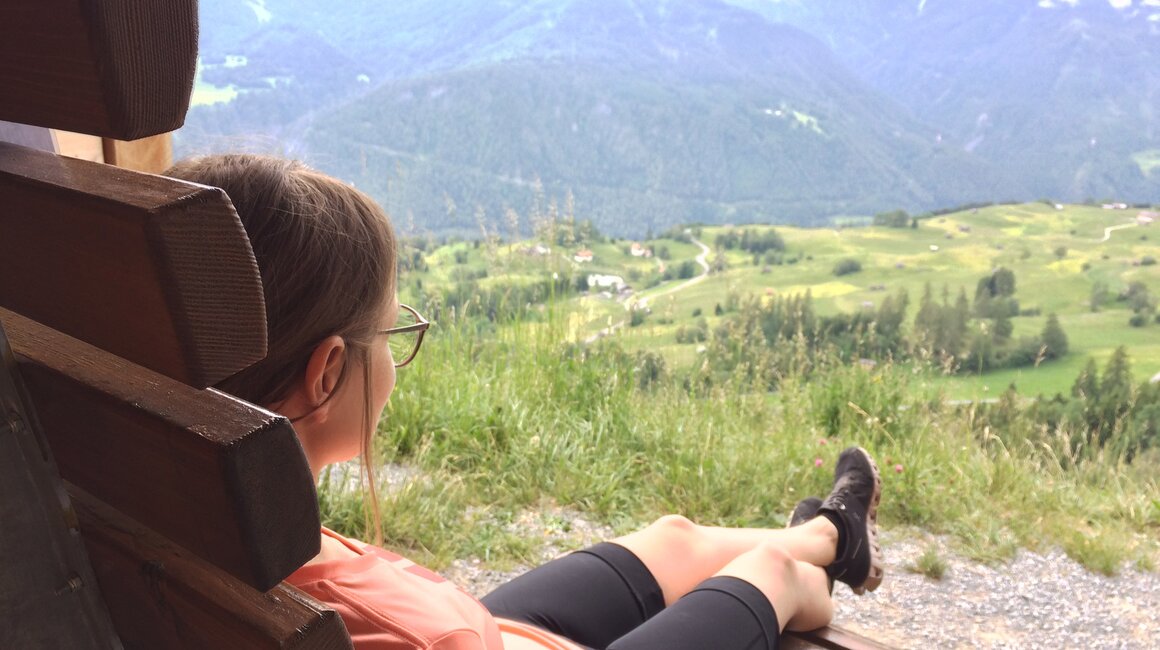 Kurvig geht es hinauf zum Falterjöchl. Dort erwartet euch eine Wohlfühlstation vom Feinsten. Hängende Wellenliegen laden zum Entspannen und Genießen ein. Dabei eröffnet die Station einen wunderbaren Blick hinunter auf die Wiesenlandschaft. Ein weiteres Highlight ist ein schwenkbares Fernglas, durch das die neugierigen Besucher die umliegende Bergkulisse erkunden können. Visiere einen Berg an und das Fernglas verrät dir seinen Namen. Hinweis: Die überdachte Station liegt in einer Rechtskurve und ist über einen schmalen Steig zugänglich. Am besten Räder unten parken oder raufschieben.