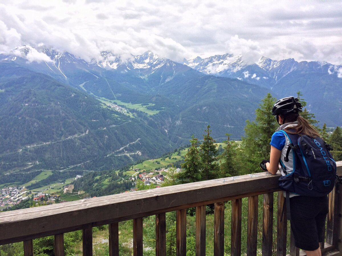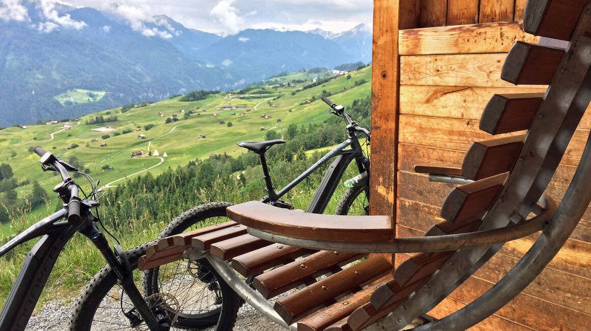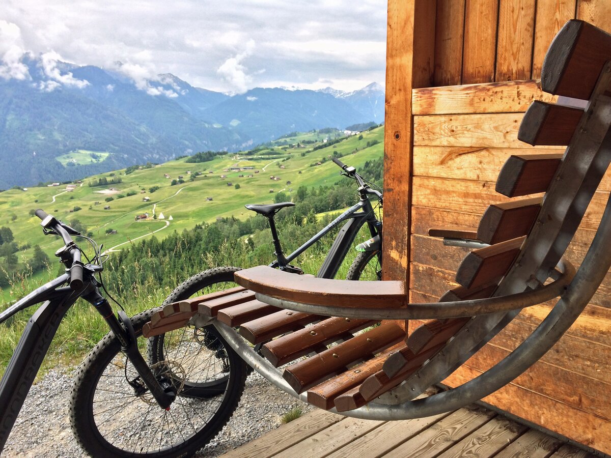 Weiter geht es auf schlottrigem Boden durch schattigen Wald. Und schon wartet das nächsten schöne Plätzchen auf euch: die Aussichtsplattform Schönegg, die den östlichsten Punkt der Tour markiert. Fünf Kilometer sind bereits geschafft. Ab dort werden Biker wieder nach Fiss gelotst. Ein zweistöckiger Holz-Pavillon inmitten von Nadelbäumen beschert dem Rastsuchenden einen grandiosen Blick auf die Natur und das Dorf Ladis. Der Weg führt zunächst unterhalb des Pavillons vorbei und schlängelt sich dann um die Wohlfühlstation herum. Augen auf! Nach einer scharfen Linkskurve versteckt sich das paradiesische Aussichtsplätzchen zu eurer linken Seite. Vorbeiradeln wäre wirklich schade!