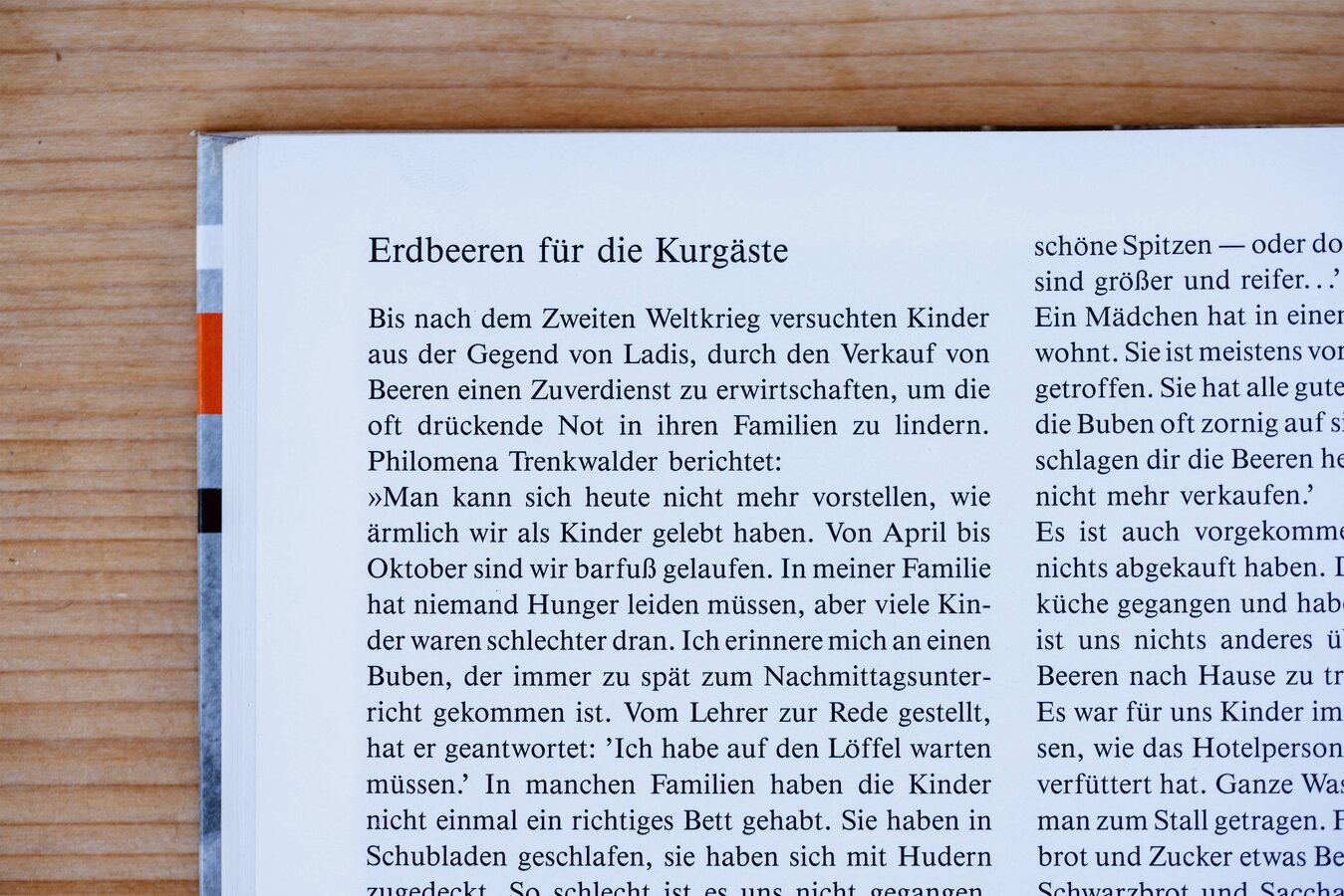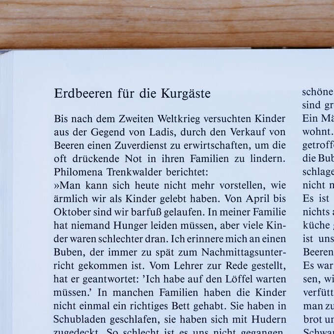 Bis etwa 1945 gab es immer wieder Erdbeerkinder in Ladis. Florian und das Team rund um das Buchprojekt konnten für Recherchen noch mit ehemaligen Erdbeerkindern sprechen - mittlerweile sind aber leider alle verstorben. Eine, die besonders viel über diese Zeit zu erzählen wusste, war Frieda Tschiderer. Sie wurde 1930 geboren und war schon als Erdbeerkind unterwegs, als sie noch nicht einmal zur Schule ging. „Sie hat auch berichtet, dass es beim Sammeln große Rivalitäten zwischen den Dörfern gab. Kinder aus Fiss durften nämlich nicht mitsammeln und wurden verjagt“, erzählt Florian. Viele der spannenden Geschichten sind auch im Buch „Sport- & Kurort Ladis“ nachzulesen.