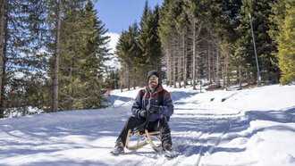 Nun gehts aber auf die Rodel. Direkt neben der Mittelstation der Schönjochbahn beginnt die Hexen-Rodelbahn, welche durch einen überdimensionalen Schlitten und einen Hexenbesen markiert ist. Auf dem breiten Weg führt uns die Rodelbahn bis zur Talstation der Schönjochbahn in Fiss. Doch auch hier müssen wir das eine oder andere Mal Halt machen, denn die Aussichten über die Tiroler Bergwelt sind einfach zu schön, um einfach nur daran vorbei zu sausen. Die Rodelbahn verfügt über ziemlich coole Kurven, Kehren und schnellen Geraden. Nach vier Kilometern Rodelspaß erreichen wir Fiss. Das hat echt Spaß gemacht!