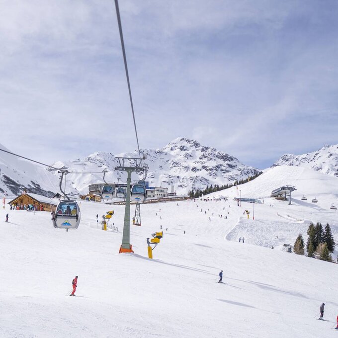 Nach dem leckeren Frühstück schmeißen wir uns in unsere Pistenoutfits und spazieren gemütlich zur Talstation der Komperdellbahn. Hier holen wir unsere Ausrüstung aus dem Depot und nehmen die nächste Gondel hinauf zur Bergstation. Wir blicken während der Fahrt über die Landschaft und können es kaum erwarten, die eine oder andere Piste hinunter zu sausen. Blauer Himmel, fast keine Wolken und jede Menge Sonne - geht es eigentlich noch besser? Apropos Sonne - zum Glück haben wir eine kleine Tube Sonnencreme im Rucksack. Damit sollten wir heute wohl nicht allzu sparsam umgehen.