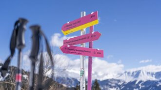Von der Bergstation Komperdell wandern wir nach dem Mittagessen auf dem markierten Panorama-Genussweg und genießen die traumhaft schönen Aussichten. Der Weg ist angenehm breit und gut ausgebaut, nur an wenigen Stellen müssen wir die Ski- und Snowboardpisten überqueren. Zu Beginn verläuft die Wanderung noch flach über die Serfauser Jochwiesen bis zum Königsleithewald und vorbei an der Bergstation Sunliner. Dort sind wir noch im Sommer mit der Zipline „Serfauser Sauser“ in vier Etappen durch die Tiroler Bergwelt gesaust. Das war vielleicht ein Abenteuer!