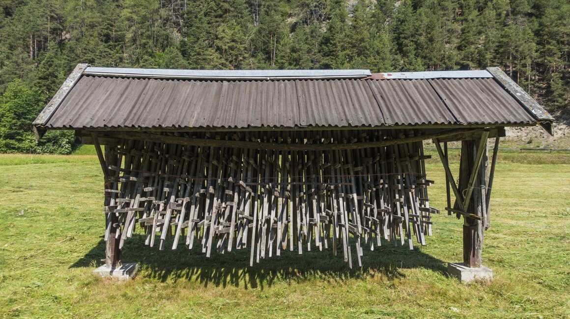 Im Tal wurde das Heu früher auf großen Wägen von Lasttieren abtransportiert. Heute verwenden die Bauern meist Pressen, die vom Traktor gezogen werden und das Heu zu Ballen formen.