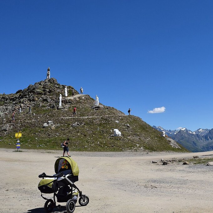 Mit dem Kinderwagen auf dem Kunstweg am Schönjoch Fiss