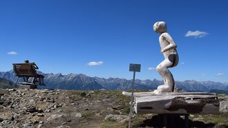 Also mache ich mich gemeinsam mit meinem kleinen Sohn auf den Weg um das neue Angebot am Fisser Schönjoch zu testen. Gestartet wird das Abenteuer mit der Schönjochnbahn bis zur Bergstation Schönjoch. Schon von der Gondel aus kann man die ersten Kunstwerke und den Einstieg bzw. das Ende des Weges sehen. Meine Empfehlung ist allerdings nicht direkt bei der Schönjochbahn den Weg zu starten, sondern zuerst am Fahrweg in Richtung Schöngampbahn zu gehen.