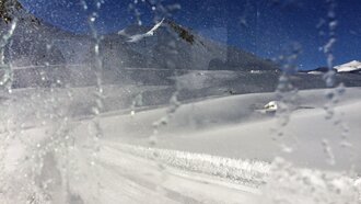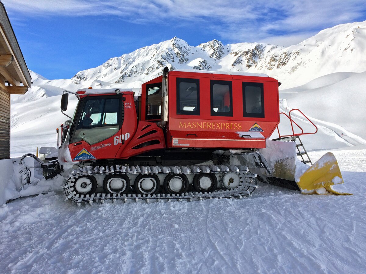 Um 10.00 Uhr bewegten sich die Ketten des Pistenbullys kraftvoll unter unseren Füßen vorwärts. Zur Sicherheit der Passagiere herrschte natürlich Gurtpflicht. Auch wenn die Schneemassen für den Bully scheinbar leicht zu überwinden waren, ruckelte es doch ganz schön. In unseren Sitzen fühlte ich mich allerdings sicher. Die Stimmung im Masner Express war super. Besonders der kleine Junge in der ersten Sitzreihe konnte sein Glück kaum fassen, als ihm Elmar einen Logenplatz vorne direkt neben ihm anbot. Vorne gab es nämlich nur Platz für einen Passagier.