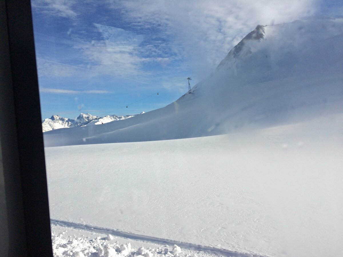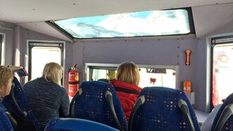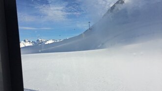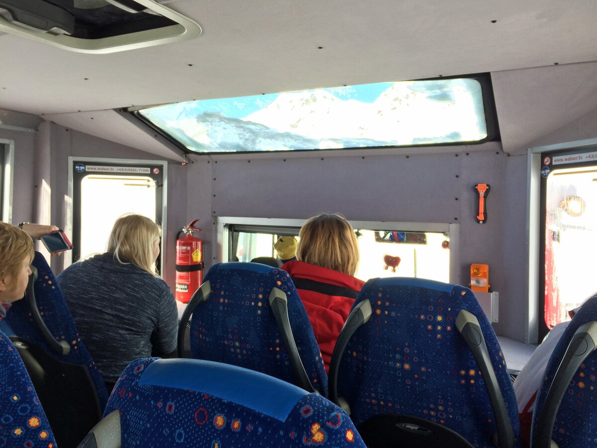 Elmar, der routinierte Pistenbully-Fahrer, baute im Handumdrehen ein Treppchen für den Einstieg zusammen. Die Kabine eröffnete ganz neue Perspektiven. Und zwar für jeden einzelnen Passagier. Denn wir alle konnten in Fahrtrichtung Platz nehmen. In der umgebauten Pistenraupe finden bis zu 17 Personen Platz. An diesem sonnigen Tag waren nur ein paar wenige Plätze frei. Neben den seitlich angeordneten Fenstern, konnte man den blauen Himmel auch durch das Dachfenster in der Kabine erkennen.