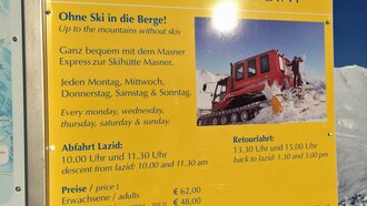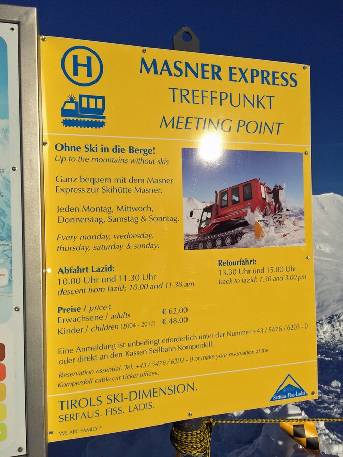 Die Fahrt führt dabei fünf Mal pro Woche (immer montags, mittwochs, donnerstags sowie samstags und sonntags) um 10.00 Uhr und 11.30 Uhr vom Lazid zur Skihütte Masner. Ohne Ski ging es für mich mit der ersten Gruppe in die alpine Winterlandschaft des Masnergebietes in Serfaus.