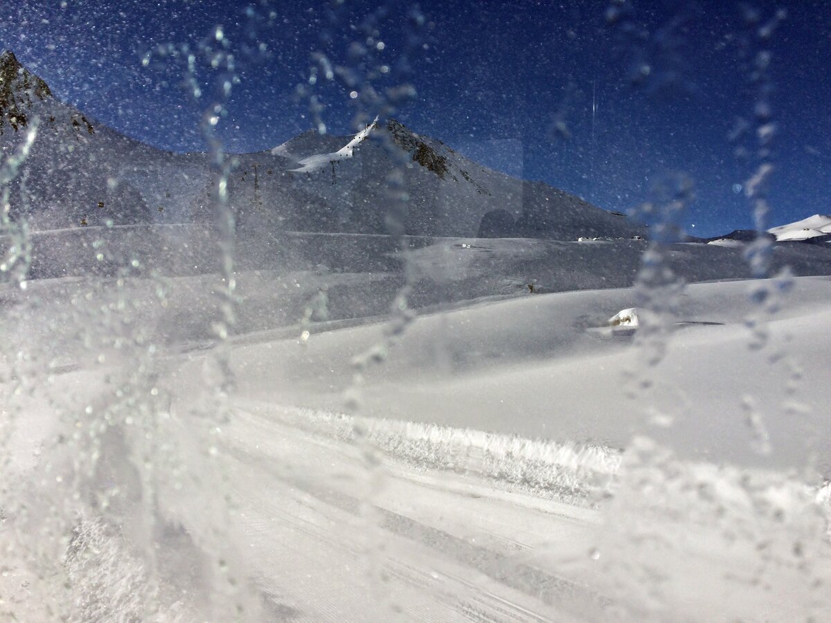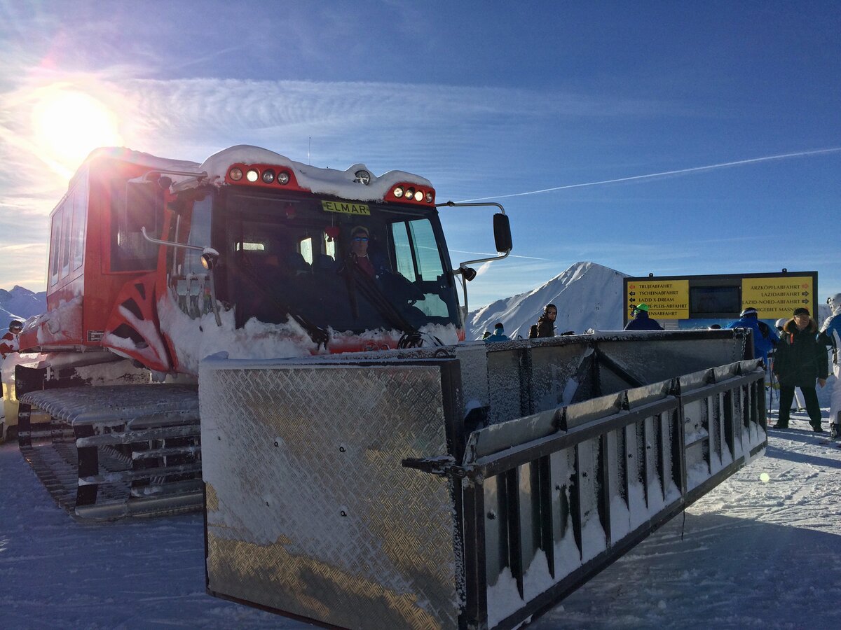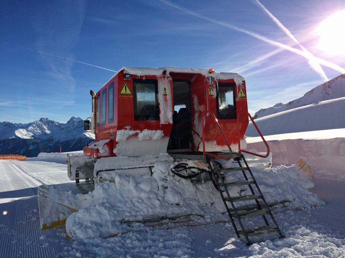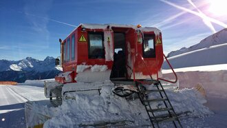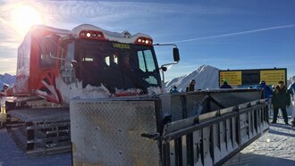 Schon der Anblick allein machte ordentlich Eindruck. Die neun Tonnen schwere umgebaute Präpariermaschine bewegte sich kraftvoll und doch virtuos über die Schneehänge zum Treffpunkt auf 2.351 m.
