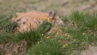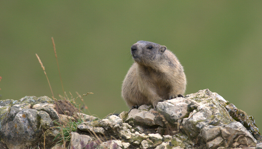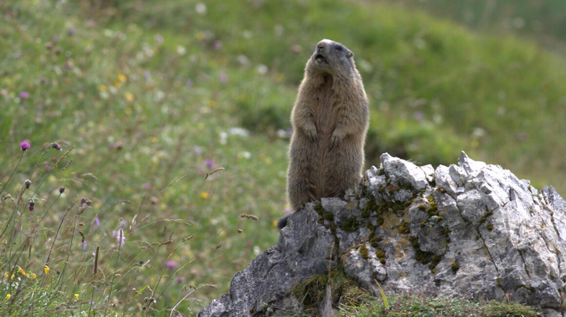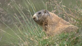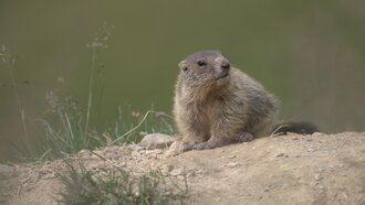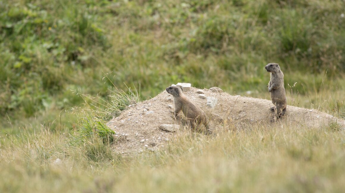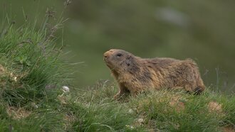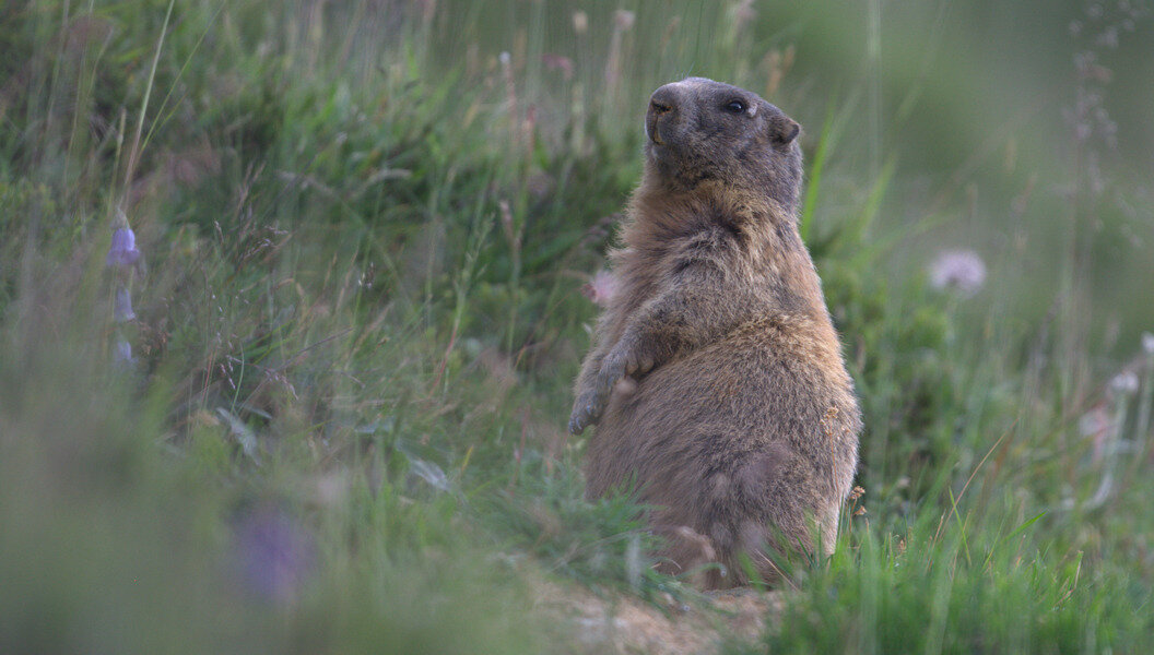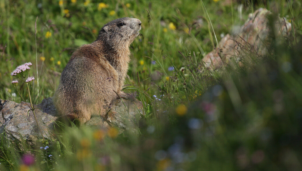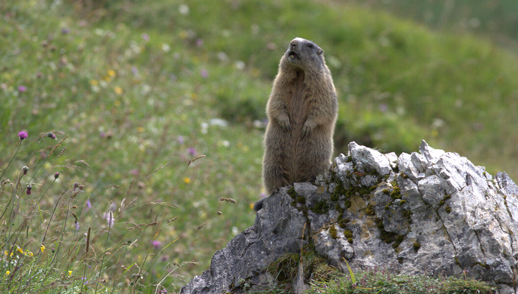 Das Alpen-Murmeltier gehört zur Unterfamilie der Erdhörnchen. Ihr Lebensraum ist oberhalb der Waldgrenze auf Alpinen Rasenflächen und es ist bei uns noch sehr häufig anzutreffen.