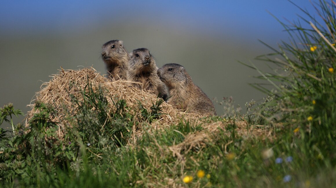 Ein ausgewachsenes Murmeltier frisst ca. 1,2 kg Gras (Blätter, Blüten, Kräuter) am Tag.