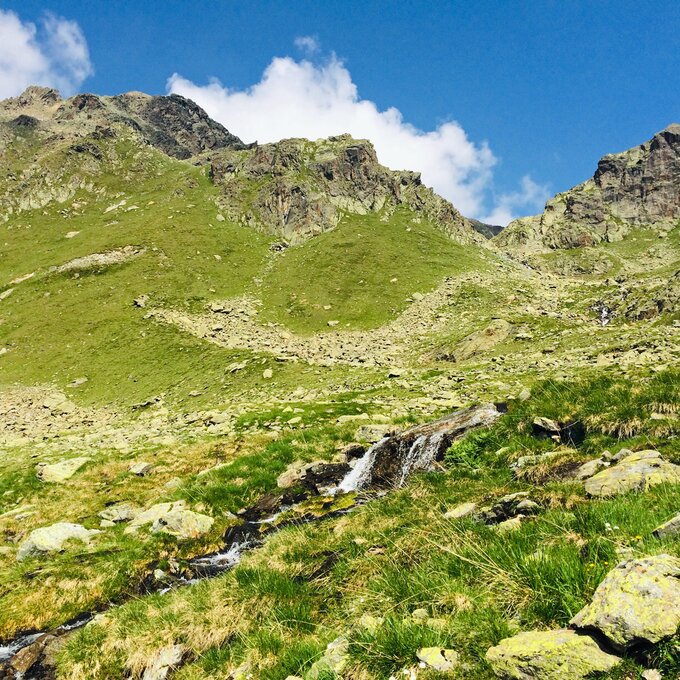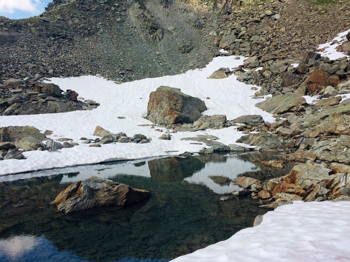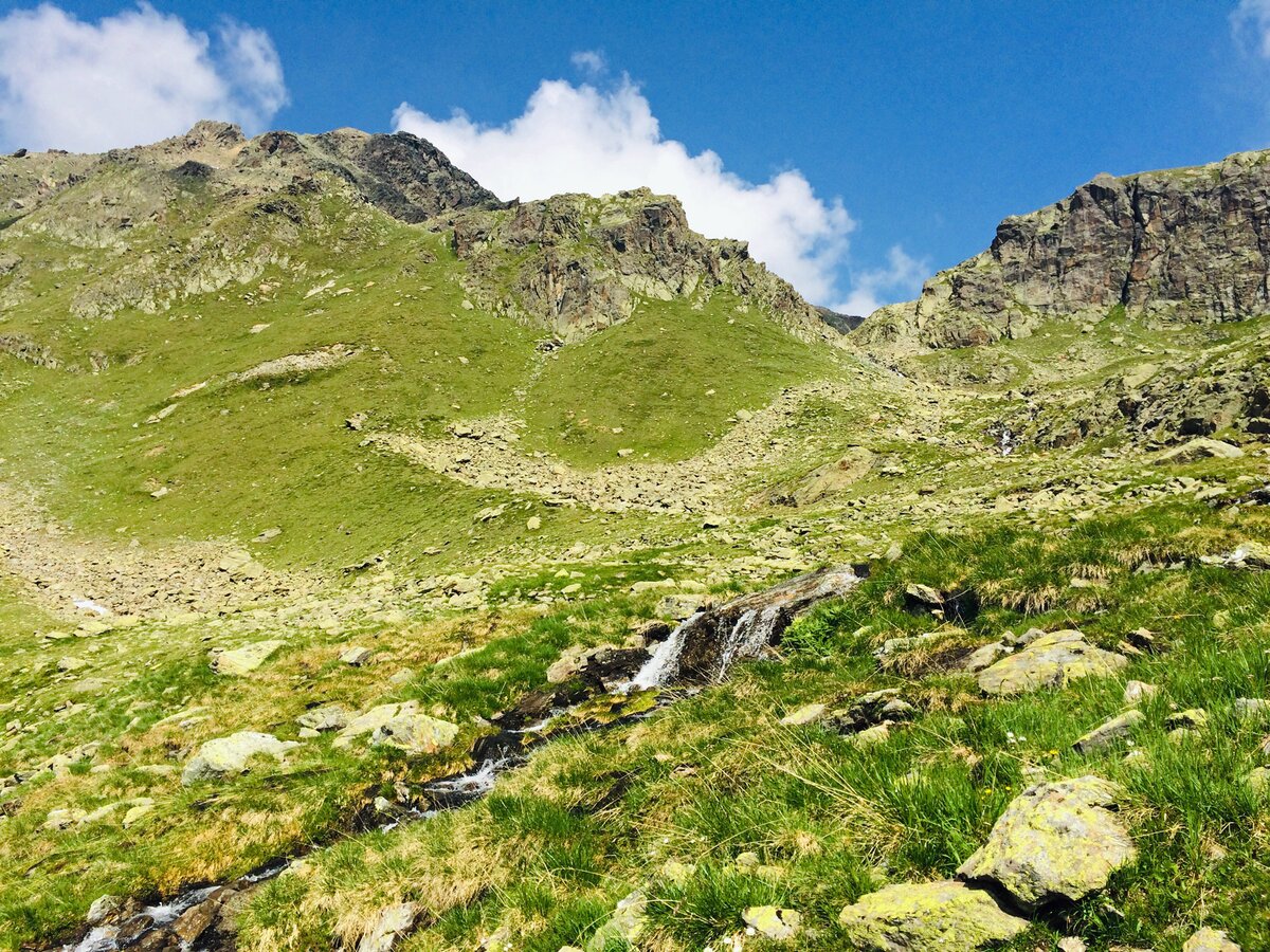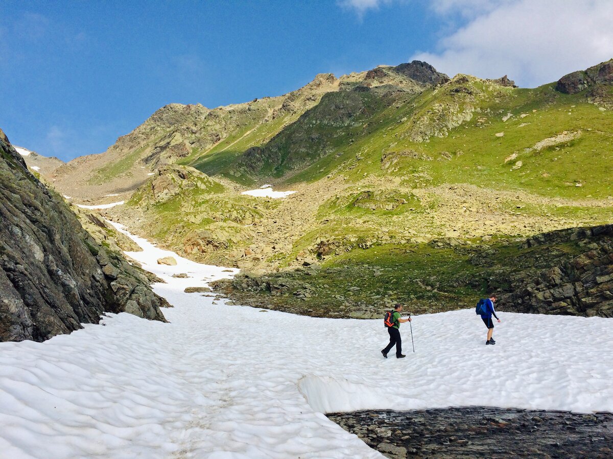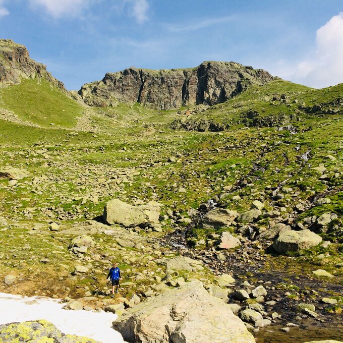 Nach ca. 40 min erreichst du über den Steig 24, der unter anderem über Gebirgsbäche und Schneefelder führt, die Oberen Glockhäuser. Das Gebirgswasser plätschert unter- und oberirdisch durch die hochalpine Gegend. Die Natur spielt ein Open-Air-Konzert für uns. Links neben der steilen Felswand führt der Weg hoch zu den Seen.
