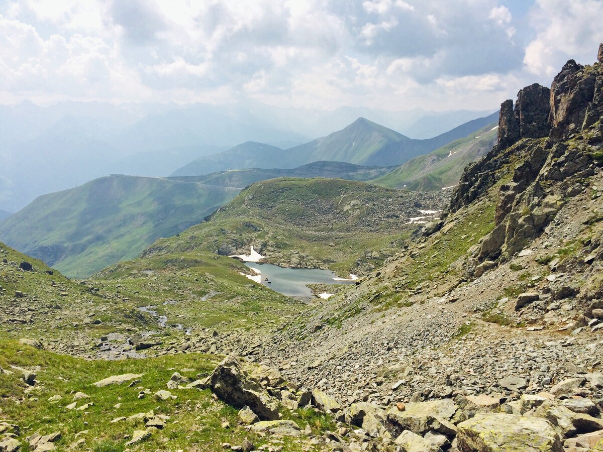 Nun folgt der Abstieg über den Weg Nr. 22a. Das Kölner Haus ist in 1 ¾ h zu erreichen. Entlang des Weges wird der Wanderer mit weiteren Gebirgsseen belohnt. Wie ein Flecklteppich wechseln sich die Unteren Glockhäuser (2.445 m) mit dem sehr steinigen Terrain ab.