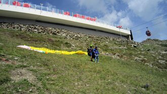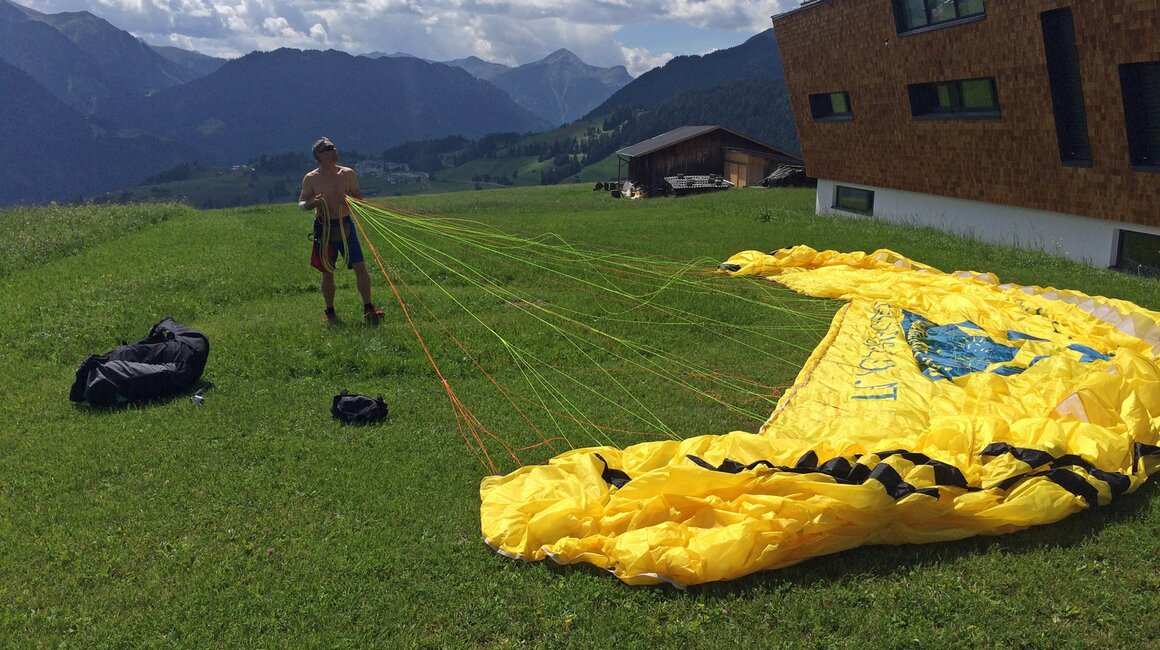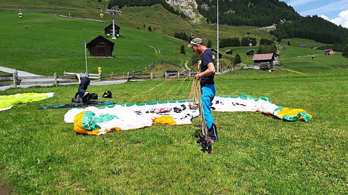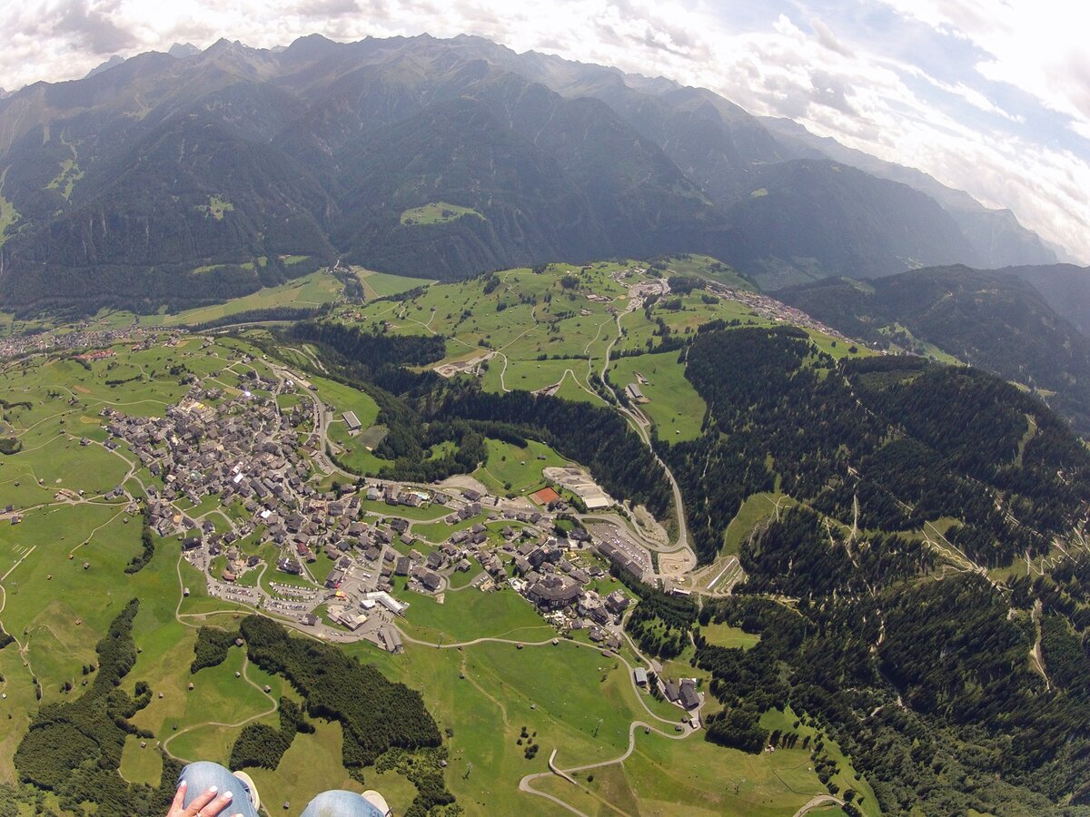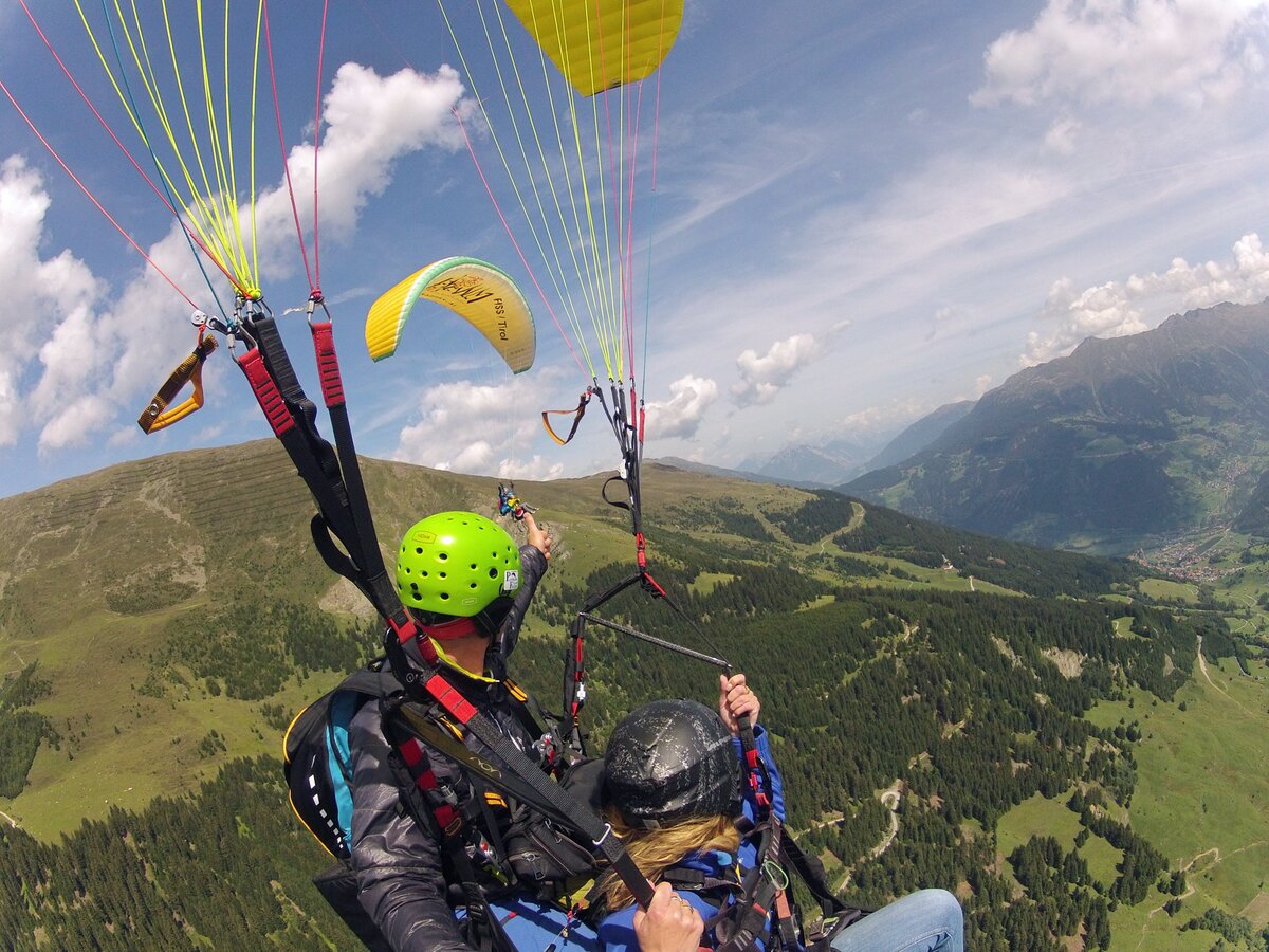 Alexandra: Als der Fluglehrer Roland vormittags anrief und uns sagte, dass an diesem Tag optimale Flugbedingungen herrschten und er noch 2 Plätze frei hätte, sagte ich sofort zu und die Vorfreude war sehr groß. Dennoch fing mein Herz an zu rasen und ich wurde sehr aufgeregt. Besonders als wir mit der Gondel zum „Abflugpunkt“ am Schönjoch in Fiss auf 2.436 m Seehöhe fuhren, gingen mir auf einmal tausend Gedanken durch den Kopf: Passt die Thermik? Hoffentlich kommt keine starke Windböe? Bin ich warm genug oder doch zu warm angezogen? Wird es mir tatsächlich Spaß machen? Kurzum: Wird alles gut gehen?