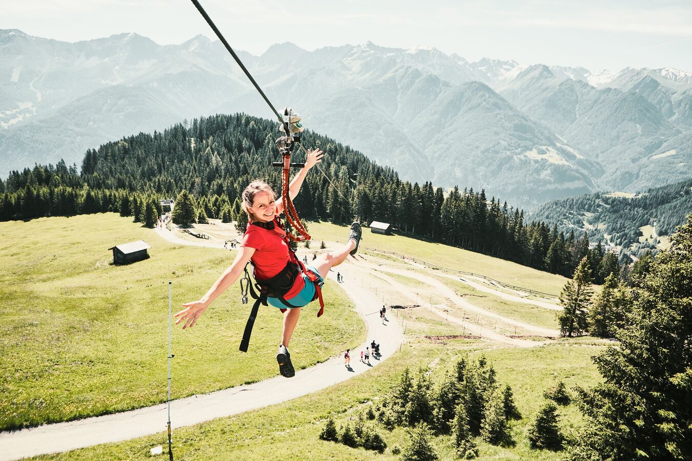 Heute verliert Mama mal den Boden unter den Füßen. Und zwar ganz bewusst, mit reichlich Glücksgefühlen im Gepäck und vor allem sicher. Kleine und große Abenteurer können nämlich in Serfaus, am Stahlseil hängend, über die Köpfe der Wanderer hinweg ins Tal sausen. Während meine zwei Kids mit ihrer Tante auf einem kinderwagentauglichen Weg talwärts rollen, schwebe ich über die Serfauser Bergwelt zur Talstation. Ob ich vor Glück schreien werde? Wir finden’s heraus …