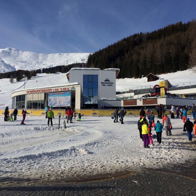 Zudem kannst du auch durch das Komfort-Skidepot (Edelweiß & Frommes) spazieren. Benutze dazu einfach den Aufzug, um auf die Höhe der Skipiste zu gelangen. Von dort aus kannst du bequem flach über den Schnee Richtung Talstation der Schönjochbahn fahren. Aber pass auf dich auf: Achte auf Skifahrer und Rodler, die sich ebenfalls auf diesem Abschnitt tummeln.
