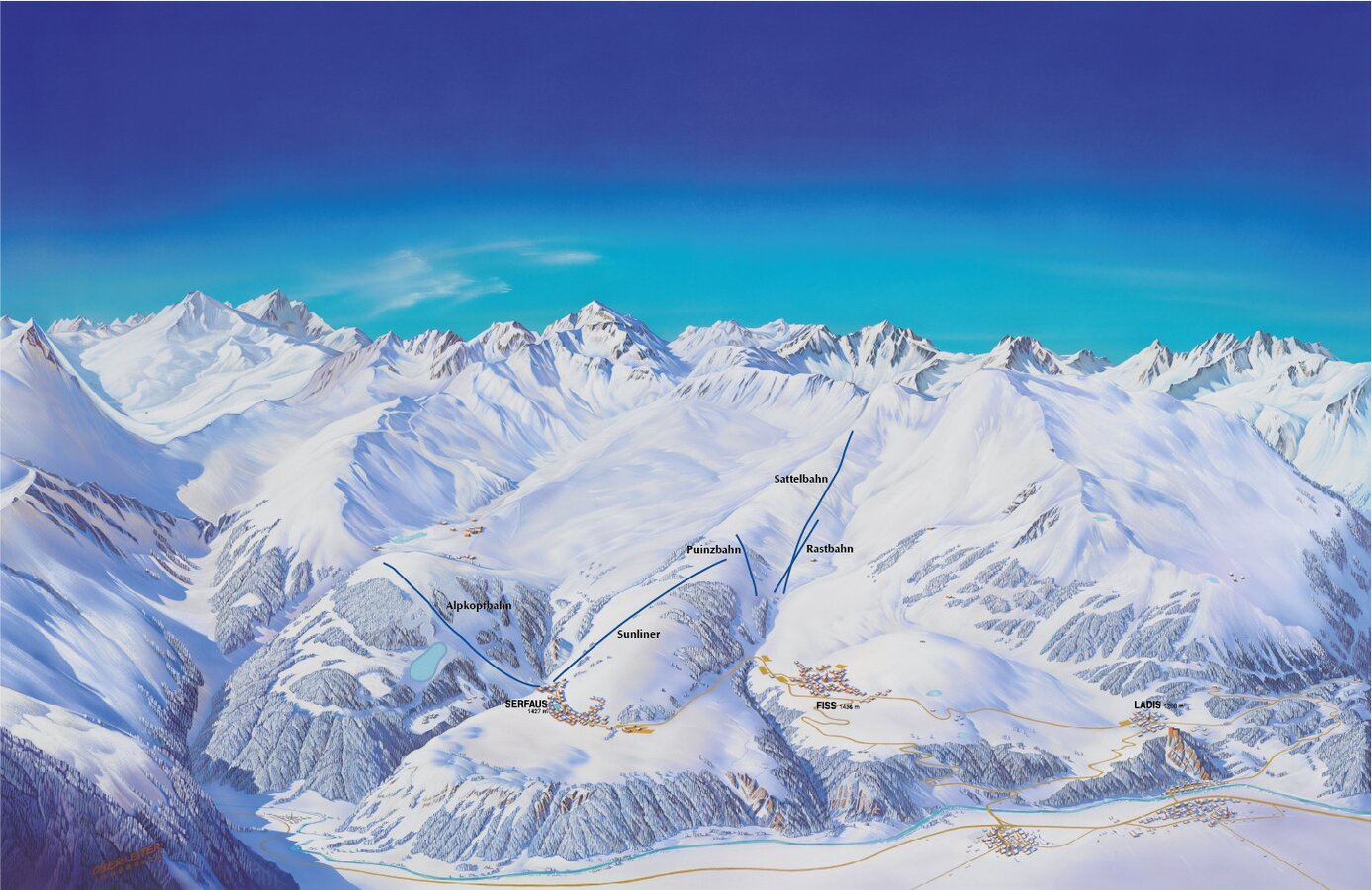 Auch in Fiss wurde maßgeblich an einer guten „Ehe“ gearbeitet und steuerte sogleich DREI NEUE KINDER bei. Im Bereich Sattelköpfe/Möseralm wurden 1999 drei 4er-Sessellifte feierlich eröffnet. Die SATTELBAHN und RASTBAHN ersetzten die damals über 30 Jahre alten Schlepplifte. Als dritter Lift in der neuen Ära der Region ging die PUINZBAHN in die Geschichtsbücher ein - eine bis heute wichtige Verbindung zwischen Serfaus und Fiss. Der neue Sessellift wurde dabei gemeinsam von beiden Seilbahnen finanziert. Neben den Aufstiegshilfen waren zudem einige Pisten für die Verbindung der zwei Skigebiete notwendig.
