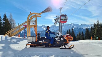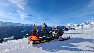 Die Skidoos SCHNURREN, der Zeitplan drängt. Die Pisten sollten vor den ersten Skifahrern kontrolliert sein. Ich nehme hinter Jonas Platz und schon geht es zügig bergwärts. Alles, was auf der Piste steht, wird von ihnen überprüft. Dabei ist ORANGE die Farbe der Stunde. Denn vieles, das auf den Pisten für Sicherheit sorgt, leuchtet in der grellen Farbe: Stangen, Pistenschilder und auch Matten um Lanzen, Schneeerzeuger, Stützen und Heustadel. „Es kann immer etwas passieren. Wir sorgen dafür, dass alle Gefahren möglichst minimiert werden. Bei den Kontrollfahrten richten wir die STANGEN am Pistenrand gerade. Bei Schlechtwetter sorgen sie für einen gut gekennzeichneten Pistenrand. Beschädigte Stangen werden ausgetauscht. Bei der Frommesabfahrt sind es insgesamt 650. Mit über 7 km ist sie die längste Abfahrt im Skigebiet. Bei den MATTEN schauen wir, dass die Öffnung immer auf der gegenüberliegenden Seite eines möglichen Aufpralls liegt“, erklärt mir Jonas.