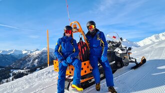 Die Rotorblätter wirbeln reichlich Schnee auf und der Pilot verliert unter Umständen innerhalb weniger Sekunden seine ORIENTIERUNG. Da muss er sich zu 100% auf den Pistenretter verlassen. Zu Beginn war mir schon etwas MULMIG, als der Pilot nur 5 cm vor mir landete“, so Jonas. „Bei der Kommunikation orientieren wir uns an den Uhrzeiten: Vor dem Piloten ist 12 Uhr, links 9 Uhr, rechts 3 Uhr und hinter ihm 6 Uhr. Wenn ich ‚C5 auf 2 Uhr‘ funke, dann weiß er, dass ich rechts vor ihm stehe. Die Anweisungen müssen passen“, fügt Lukas hinzu.