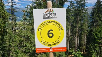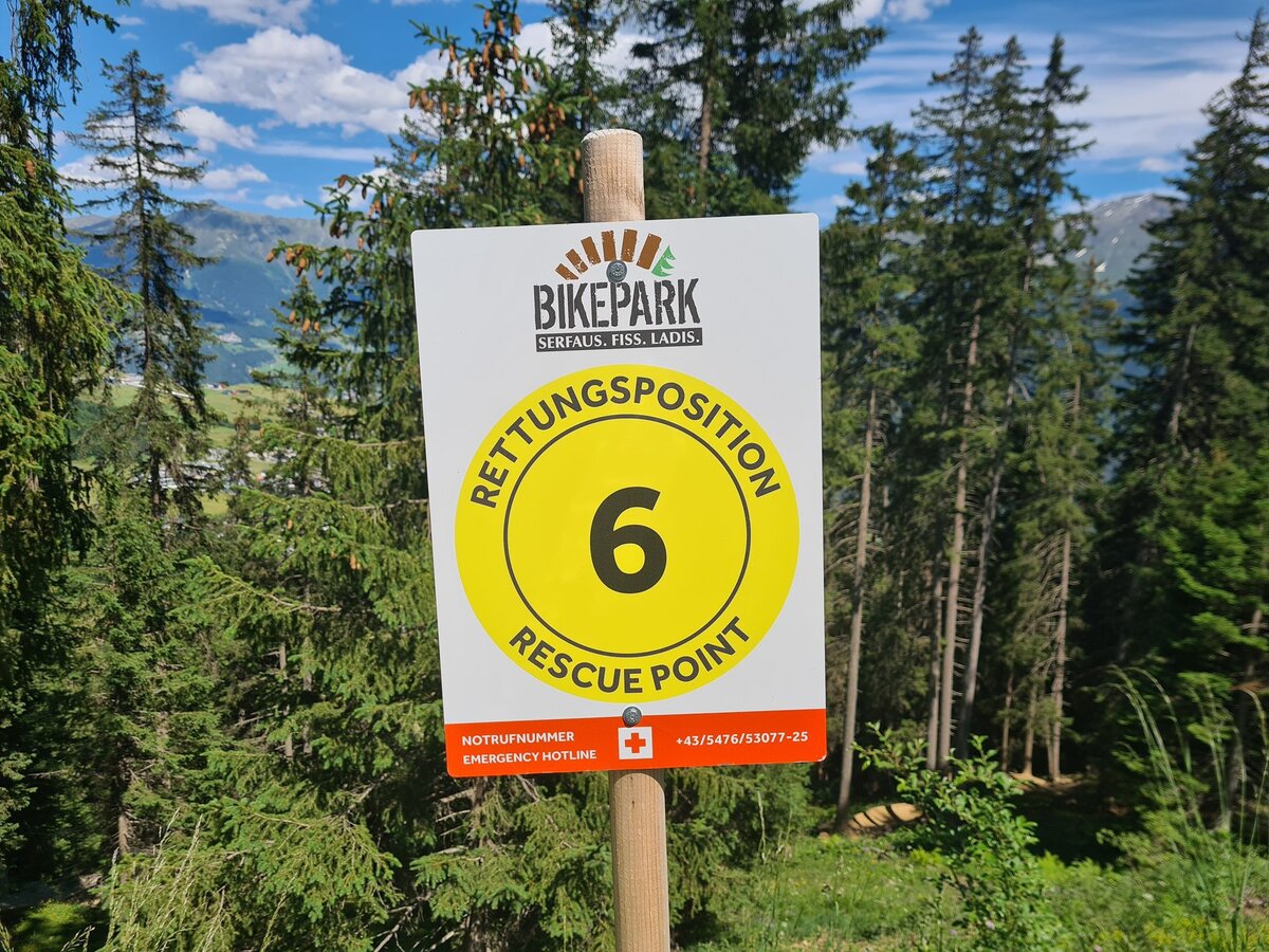 Die wichtigsten RETTUNGSNUMMERN sind auf der Bikekarte, am Rahmen der Verleihbikes im Bikepark sowie auf Notfallplaketten entlang der Singletrails zu finden.