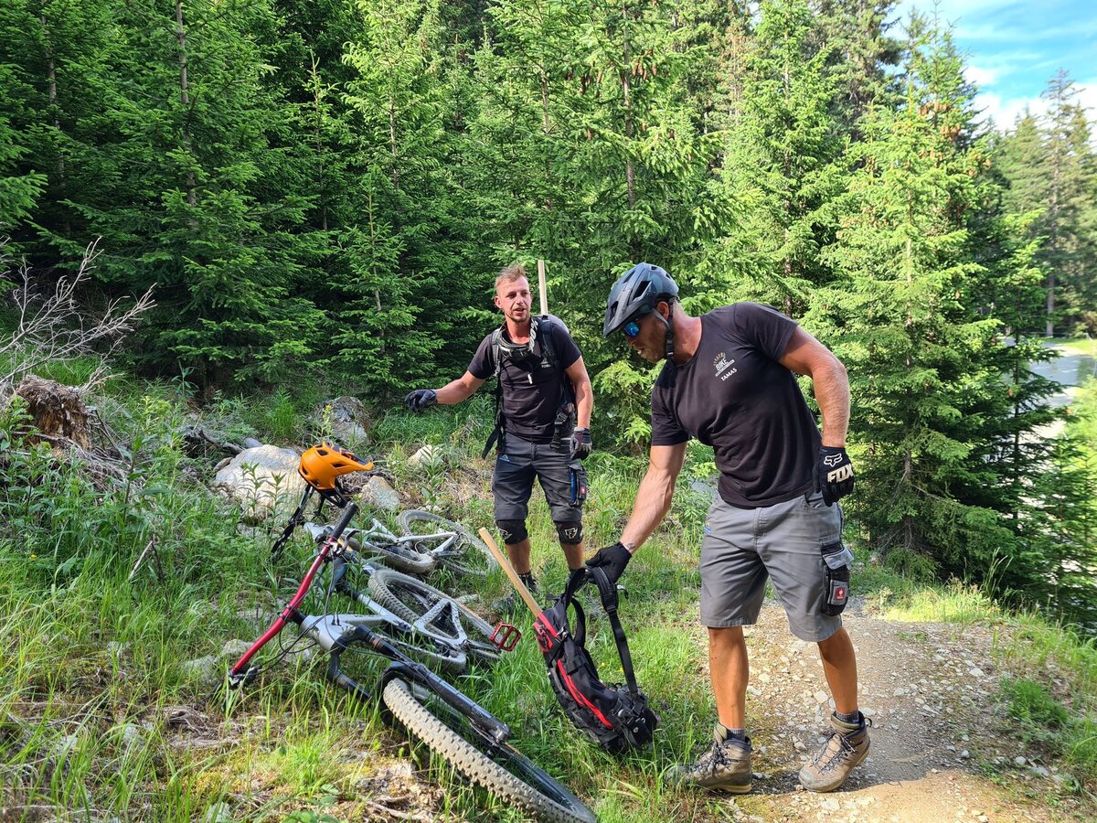 Unfälle können jederzeit passieren – deshalb ist die Sicherheit im Bikepark und auf den Singletrails besonders wichtig. Im Bikepark stehen speziell ausgebildete Bikepark-RETTER bereit, die auch im Winter bei der Pistenrettung im Einsatz sind. Kommt es auf den Singletrails zu einem Unfall, sorgt die Bergrettung für schnelle Hilfe.