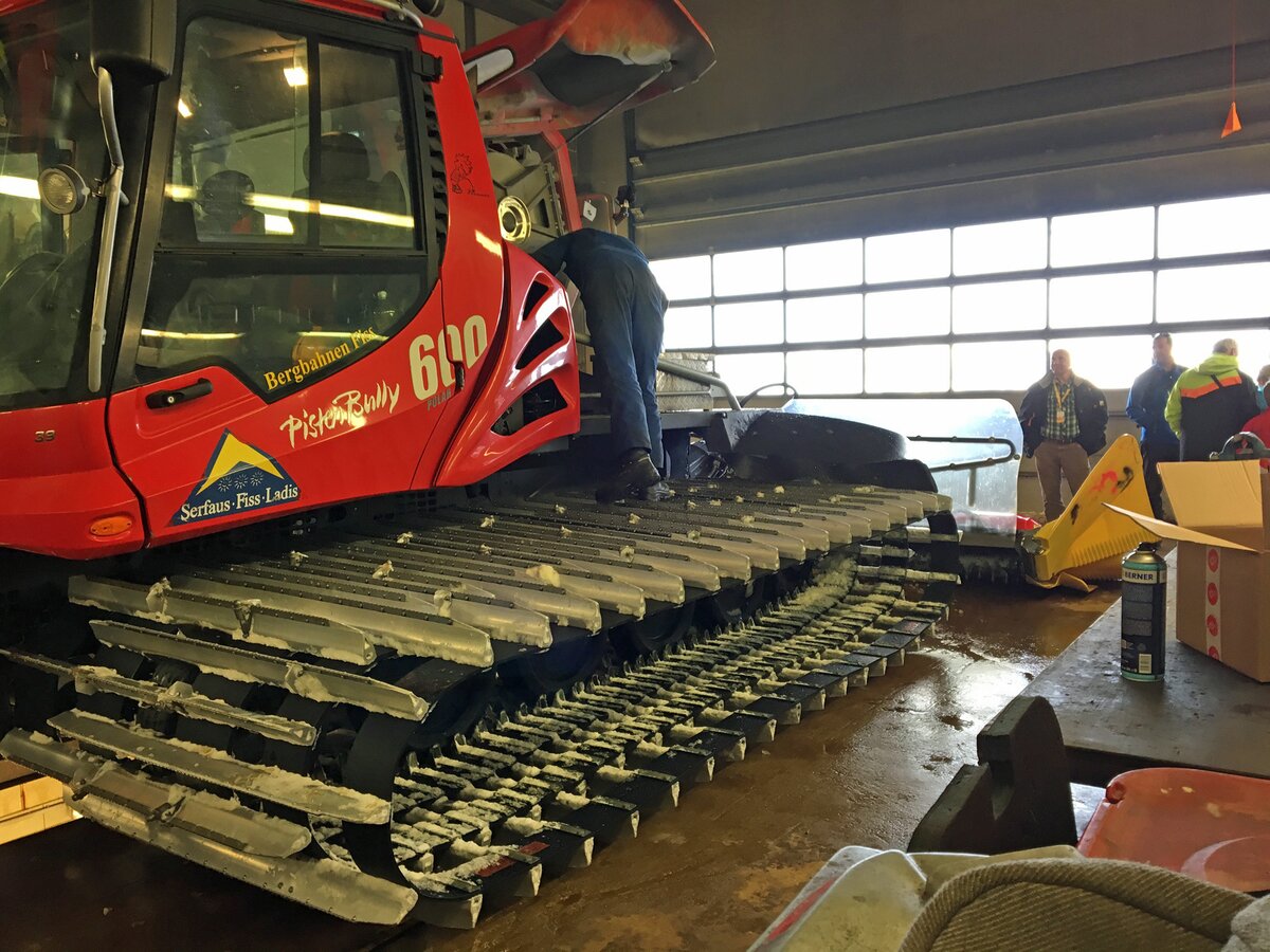 Oben am Joch angekommen, gingen wir gemeinsam in das sich etwas unterhalb befindende Lager, welches versteckt in den Berg gebaut ist. Dort werden sämtliche Schilder und Pistenmarkierungen aufbewahrt und gewartet. Hier oben werden zudem die Pistenfahrzeuge von den betriebsinternen Mechanikern in einer speziell ausgestatteten Werkstatt repariert. Derzeit sorgen 45 Pistengeräte in Tirols Skidimension Serfaus-Fiss-Ladis täglich dafür, dass die 214 Pistenkilometer am Morgen stets top präpariert sind. Die Hauptbetriebszeiten unserer Pistenbullyfahrer sind stets außerhalb der Betriebszeiten der Bergbahnen – also am Abend oder mitten in der Nacht, wenn unsereins schon friedlich schläft. Die 12 Tonnen wiegenden Kolosse sind sogar mit GPS ausgestattet, sodass genau eingesehen werden kann, wie viel Schnee derzeit auf der Piste liegt und wie viel technisch erzeugter Schnee noch wohin geschoben werden muss. Dies ermöglicht ein effizientes Verteilen des weißen Goldes auf die Pisten.